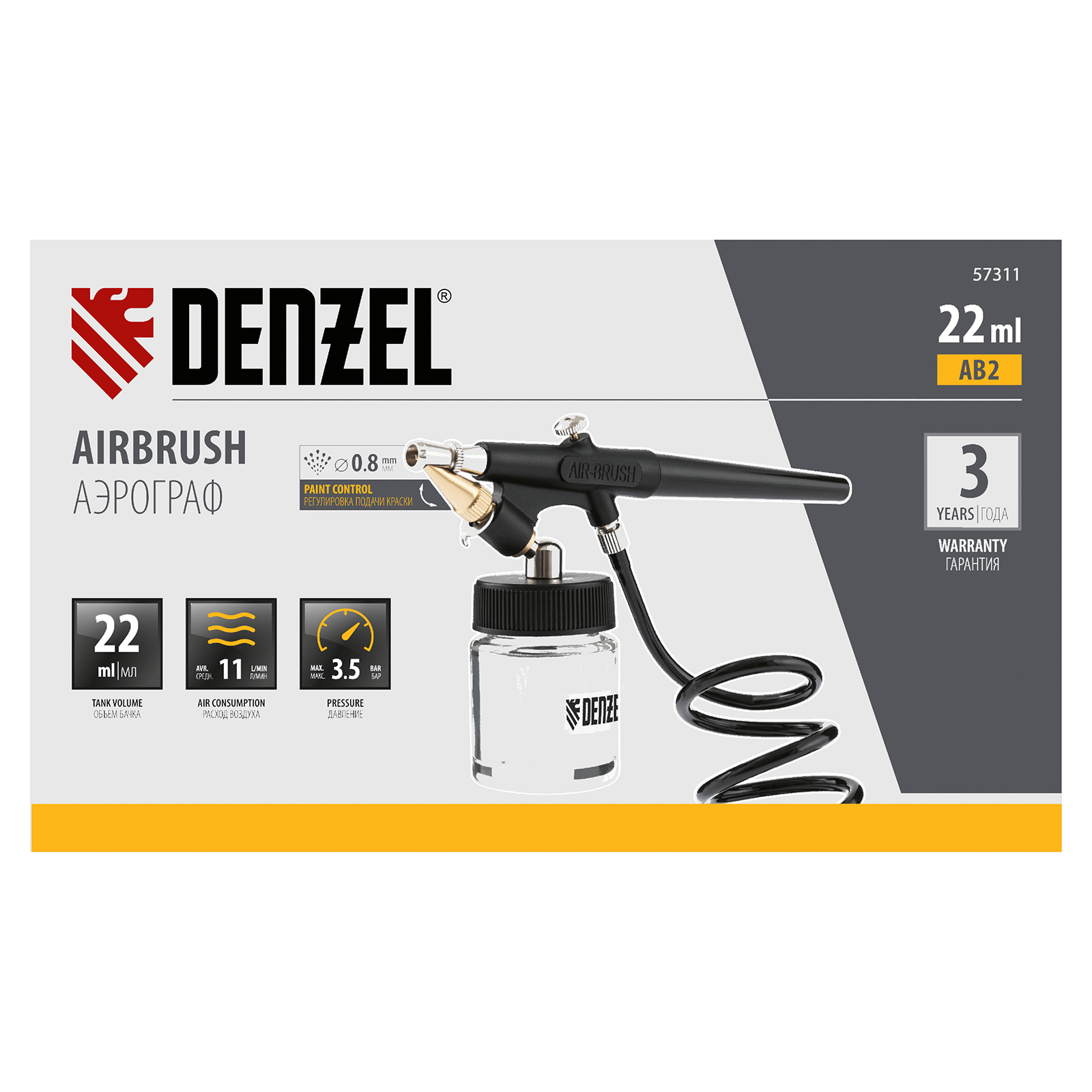 Аэрограф с нижним бачком AB2, 0,8 мм, 22 мл, 11 л/мин Denzel