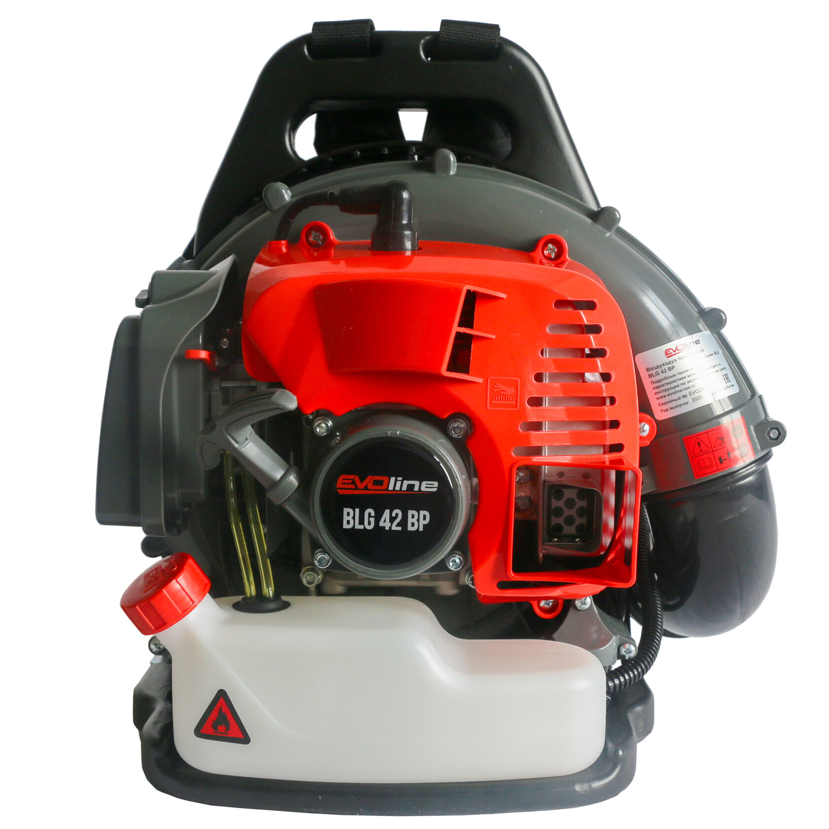 Двигатель воздуходув EVOline BLG 42 BP установлен на ранцевое основание, что позволяет снять нагрузку с рук оператора, а вместительный топливный бак дает возможность работать остановки долгое время.
