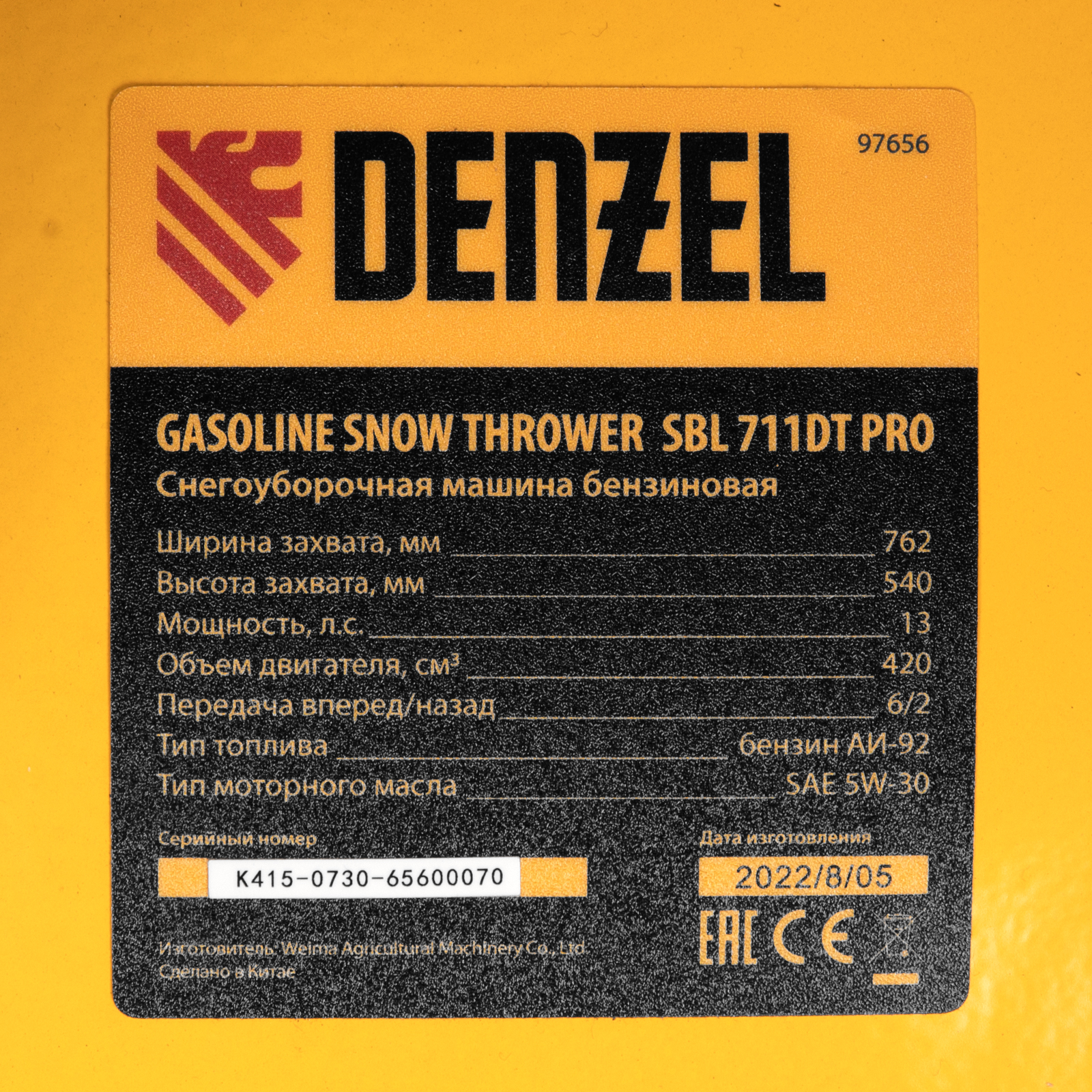 Бензиновая снегоуборочная машина SBL 711DT PRO, 420cc, гусеницы, эл.старт, блок. дифф. Denzel