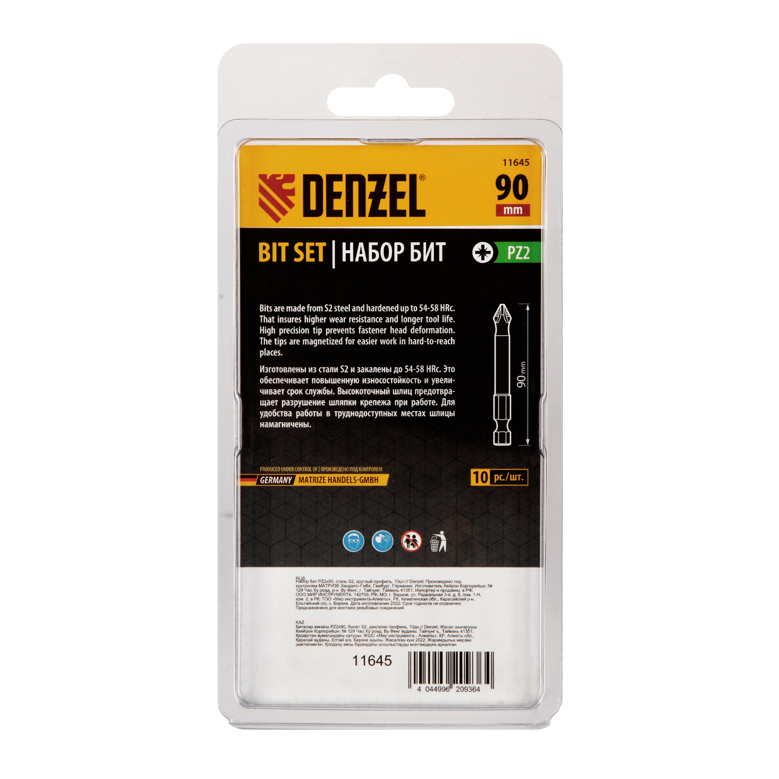 Набор односторонних бит PZ x 90 мм Denzel 11645 включает в себя 10 сменных насадок из стали S2 с крестообразными шлицами Pozidriv и шестигранными хвостовиками 1/4". Профессиональная оснастка рассчитана на работу с шуруповертом, обеспечивает быстрый монтаж и демонтаж резьбовых соединений с углублением PZ2. Устойчивое сцепление с крепежом благодаря дополнительным ребрам на шлице Позидрайв позволяет увеличить крутящий момент и снизить риск соскакивания биты.