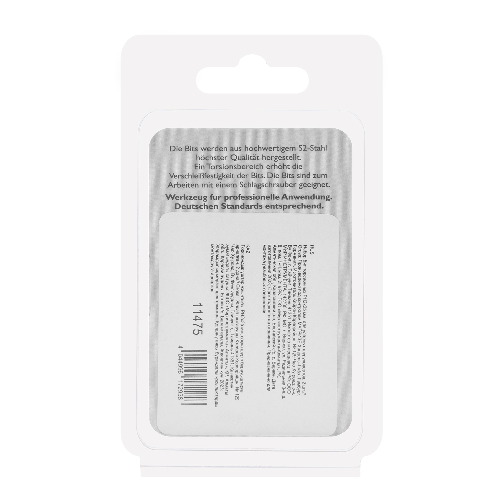 Набор торсионных бит PH2 x 25 мм Gross 11475, 2 шт., предназначен для монтажа и демонтажа резьбовых соединений с помощью ударного шуруповерта. Он незаменим в строительных, слесарных и монтажных работах, в автосервисах, при проведении ремонта в доме. Торсионная зона способна пружинить, за счет чего она частично амортизирует тангенциальный удар от шуруповерта. Такое решение позволяет равномерно распределить нагрузку по бите и избежать поломки шлица.