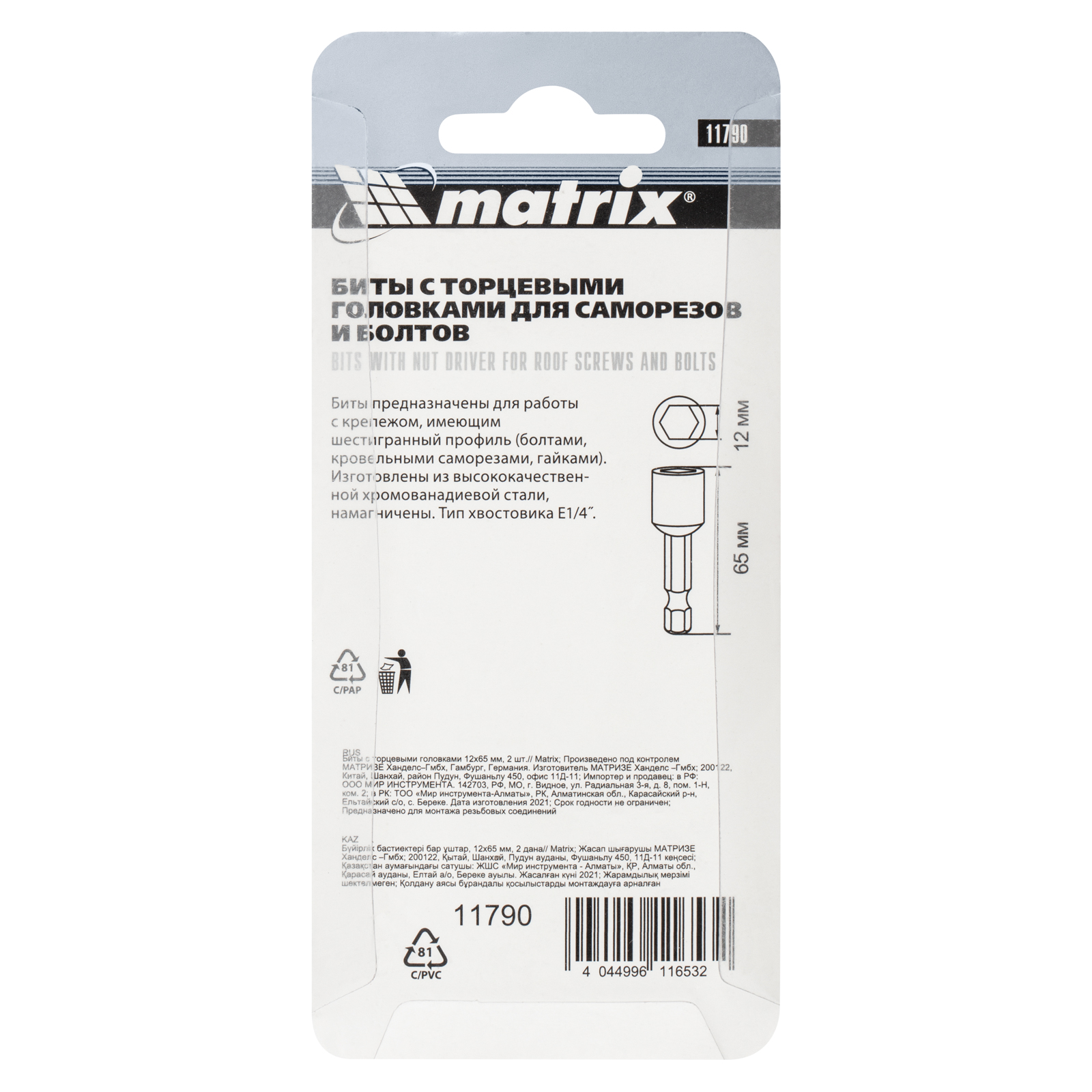 Биты с торцевыми головками Matrix 11790 размером 12 х 65 мм, 2 шт. в уп., предназначены для работ с шуруповертом. Используются при монтаже и демонтаже болтов и шурупов, а также кровельных саморезов с внешним шестигранником. Увеличенная длина 65 мм облегчает работу в труднодоступных местах. Биты способны полностью заменить торцевые головки, особенно если под рукой нет трещотки.