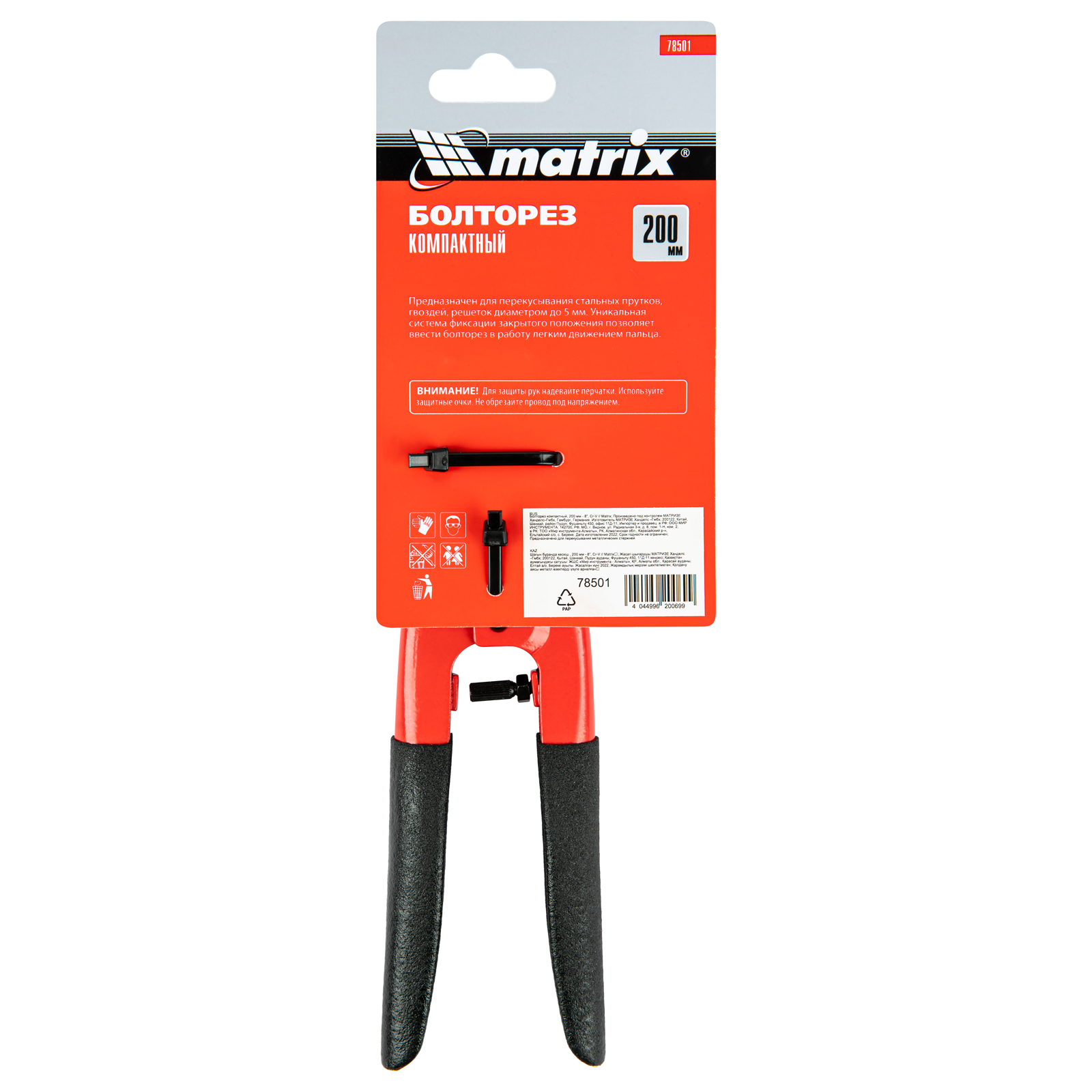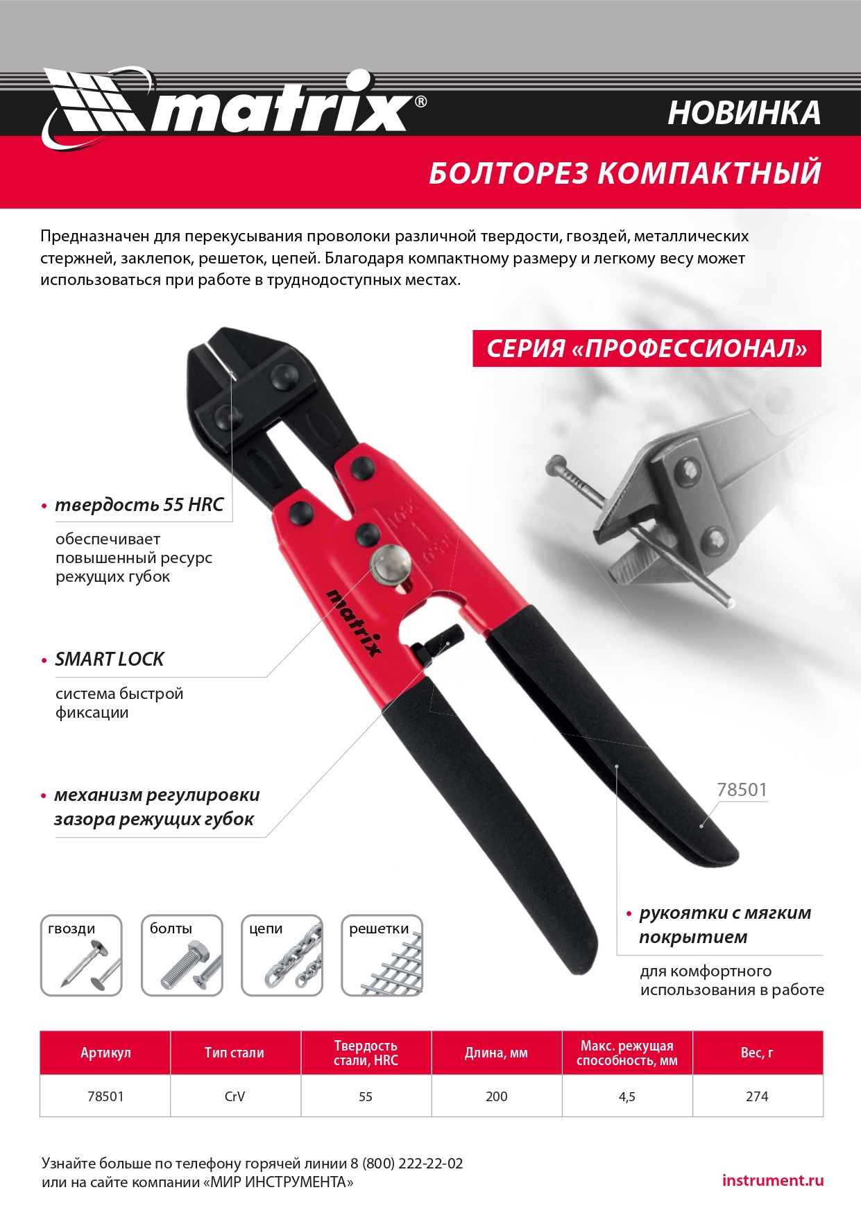 Компактный болторез Matrix 78501 длиной 200 мм (8″), из стали CrV, предназначен для перекусывания гвоздей, болтов, проволоки различной твердости, а также металлических стержней, заклепок, цепей и решеток толщиной до 5 мм. Благодаря компактности и малому весу 274 г оптимален для работы в труднодоступных местах. Инструмент рекомендован профессиональным работникам для проведения слесарных, строительных, спасательных работ.