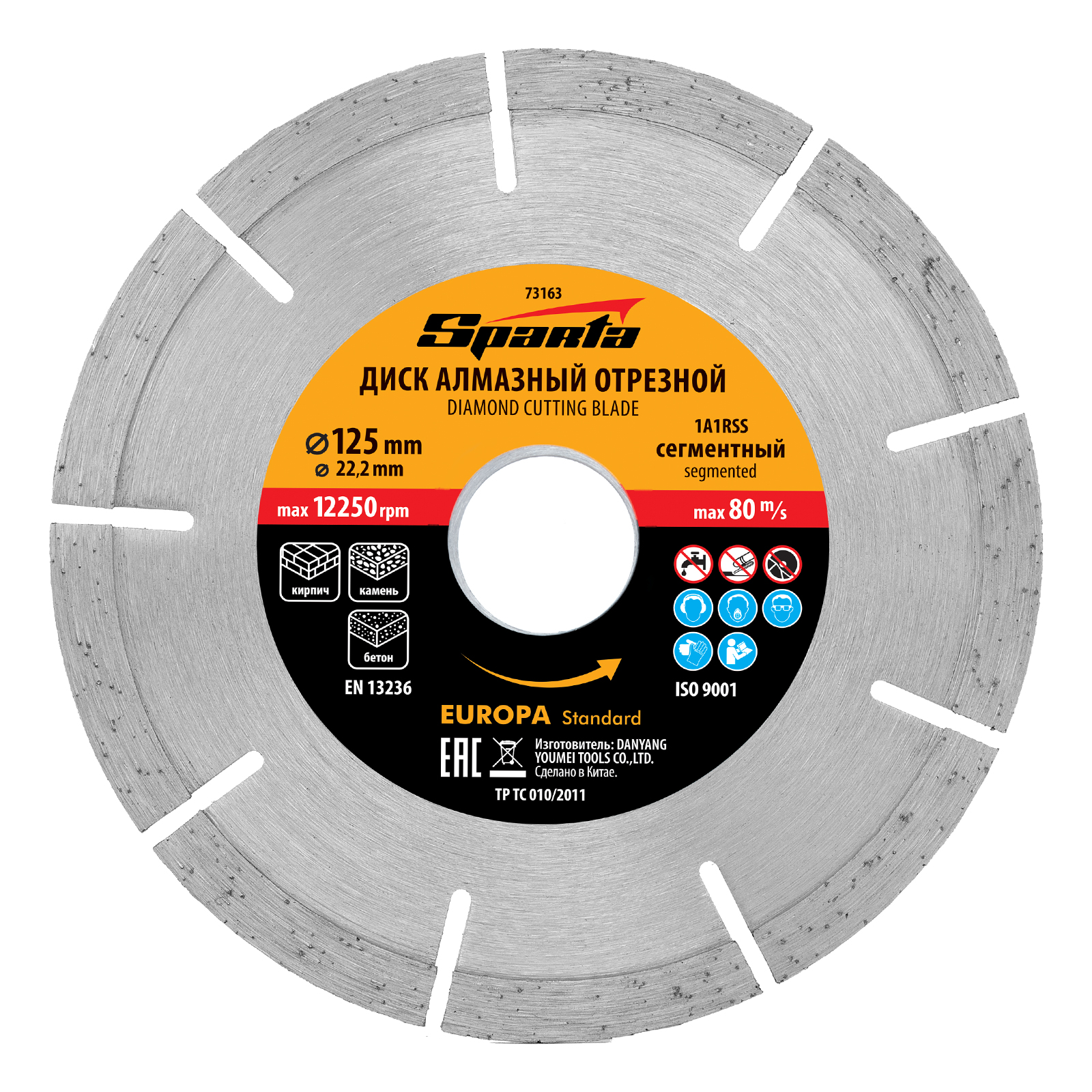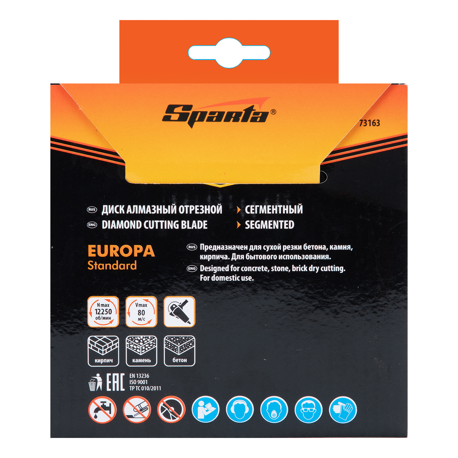 Диск алмазный отрезной сегментный Sparta EUROPA Standart 73163 диаметром 125 х 22,2 мм предназначен для сухой резки бетона, в том числе свежего, камня, кирпича, шлакоблока и тротуарной плитки. Он устанавливается на углошлифовальные машины с посадочным диаметром 22,2 мм. Диск оптимально подходит для бытового использования.