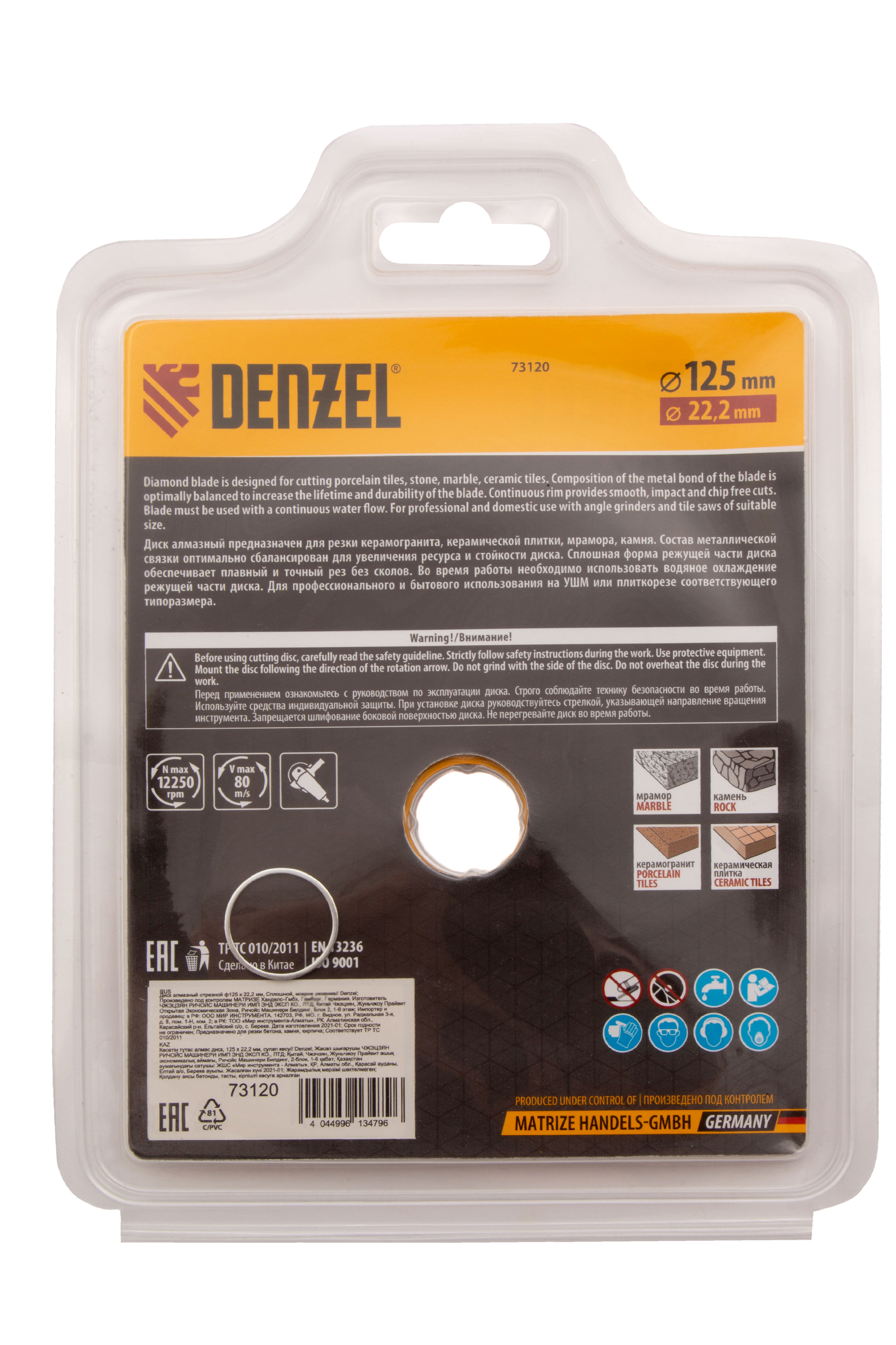 Отрезной алмазный диск Denzel «Сплошной» 73120 диаметром 125 х 22,2 мм используется для «мокрого» резания совместно с углошлифовальной машиной или плиткорезом с соответствующим посадочным диаметром. Режет камень, мрамор, керамогранитную и керамическую плитку. Диск отличается хорошей производительностью за счет высокой скорости реза, поэтому подходит для профессионального применения.