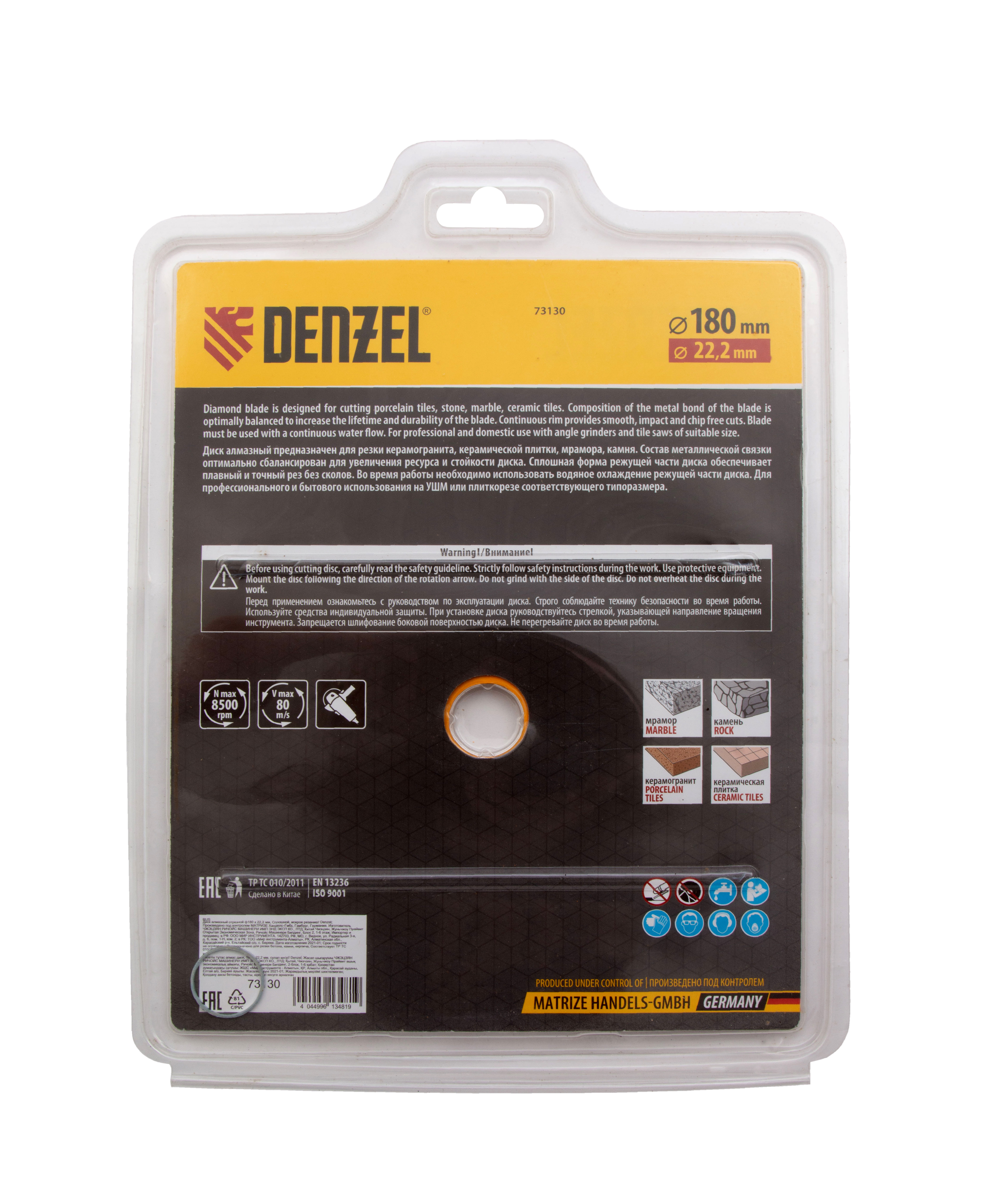 Отрезной алмазный диск Denzel «Сплошной» 73130 диаметром 180 х 22,2 мм используется для «мокрого» резания совместно с углошлифовальной машиной или плиткорезом с соответствующим посадочным диаметром. Режет камень, мрамор, керамогранитную и керамическую плитку. Диск отличается хорошей производительностью за счет высокой скорости реза, поэтому подходит для профессионального применения.