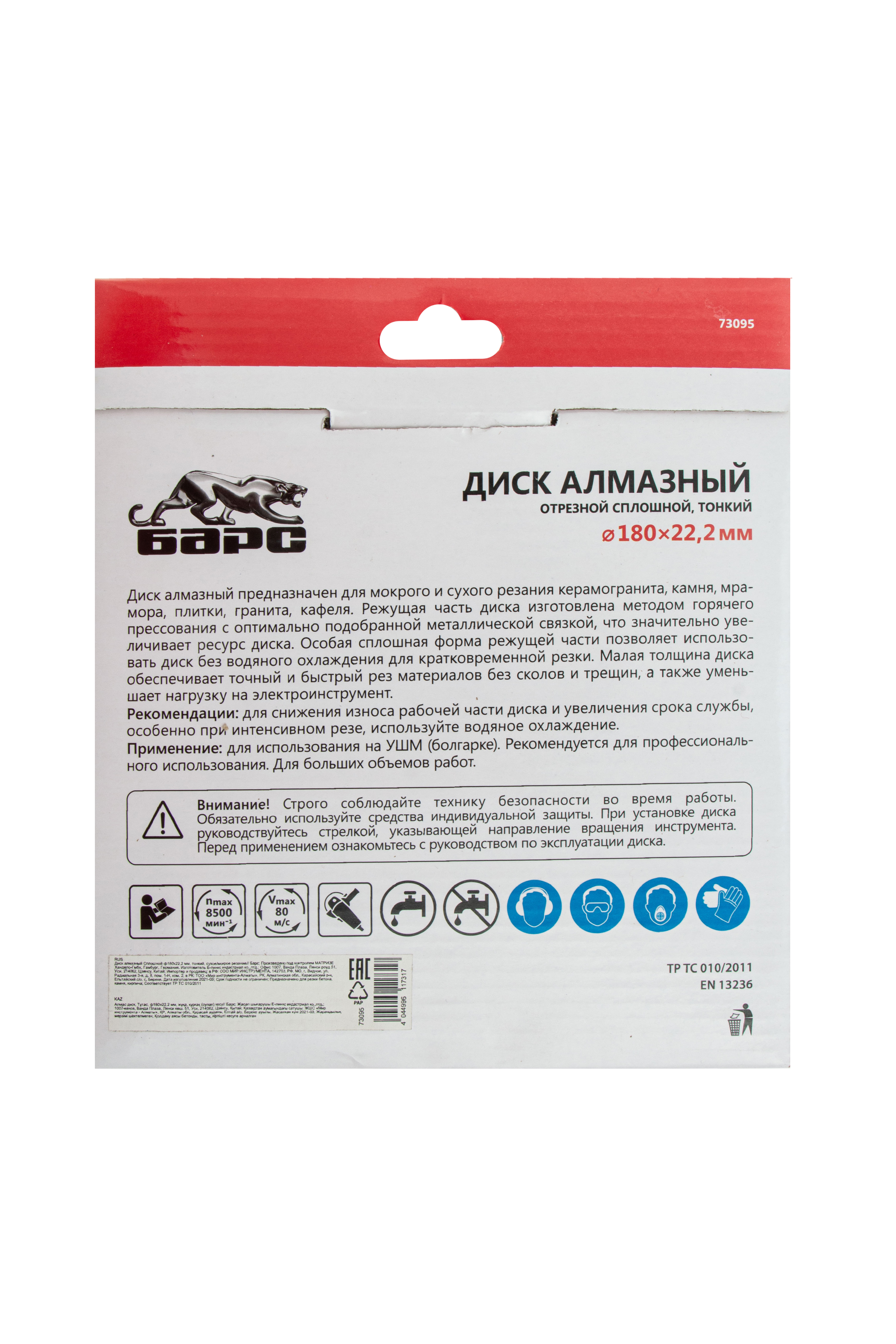 Тонкий сплошной алмазный диск Барс 73095 диаметром 180 х 22,2 мм с особой формой рабочей части применяется как для сухого, так и «мокрого» резания гранита и керамогранита, плитки, кафеля, мрамора, искусственного и натурального камня с помощью УШМ или плиткореза. Обеспечивает быстрый качественный рез без сколов. Уменьшенная толщина диска позволяет снизить нагрузку на рабочий инструмент при резке керамогранита и других твердых материалов. Диск предназначен для профессиональной эксплуатации. Использование водяного охлаждения увеличивает ресурс диска и повышает качество реза.