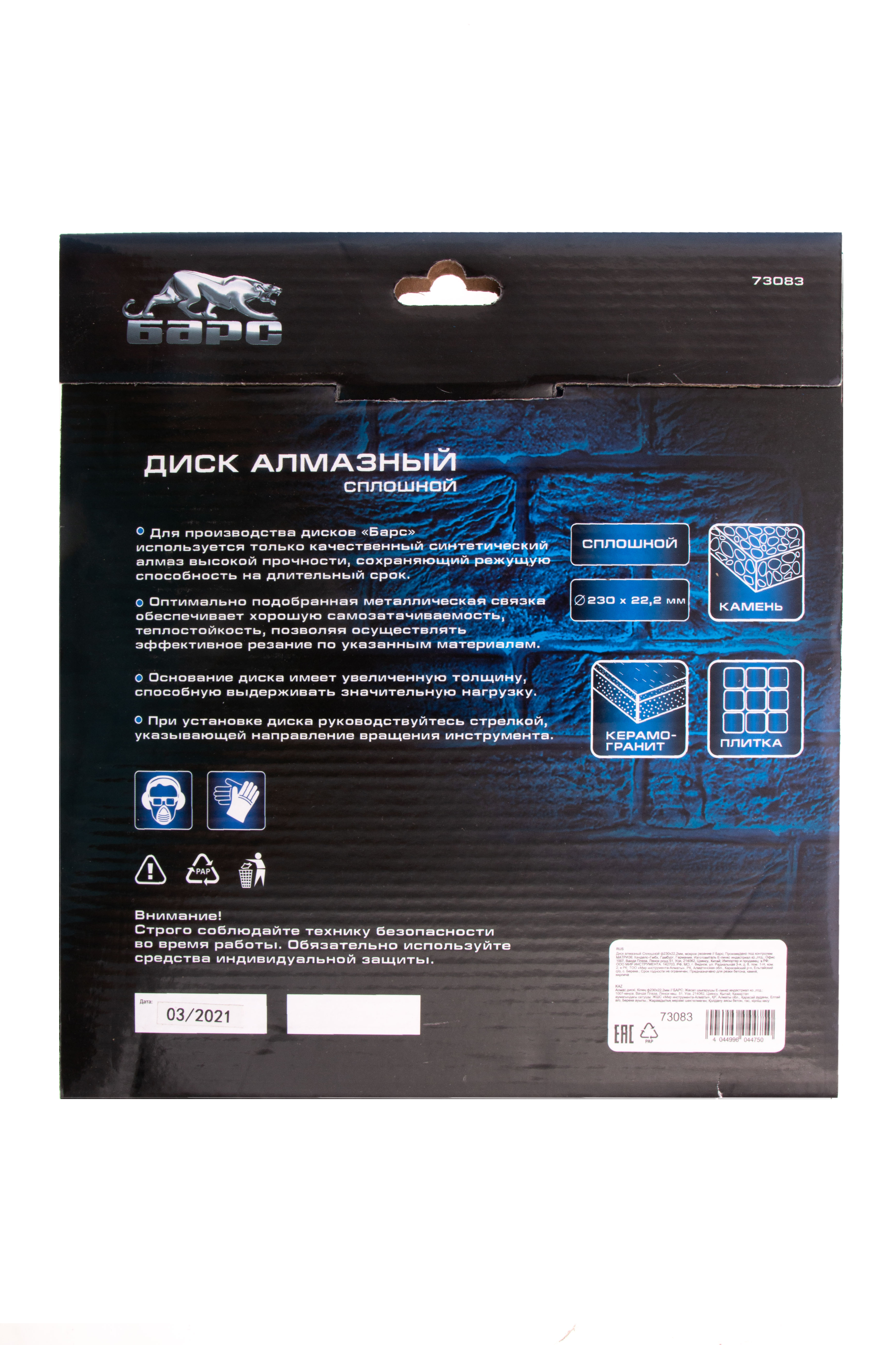 Сплошной алмазный диск Барс 73083 диаметром 230 х 22,2 мм применяется совместно с УШМ или плиткорезом для мокрой резки твердых материалов: гранита и керамогранита, кафеля, плитки, мрамора, натурального и искусственного камня. Диск сплошной формы обеспечивает ровный рез без трещин и сколов. Использование водяного охлаждения позволяет избежать перегрева диска и увеличить его ресурс.