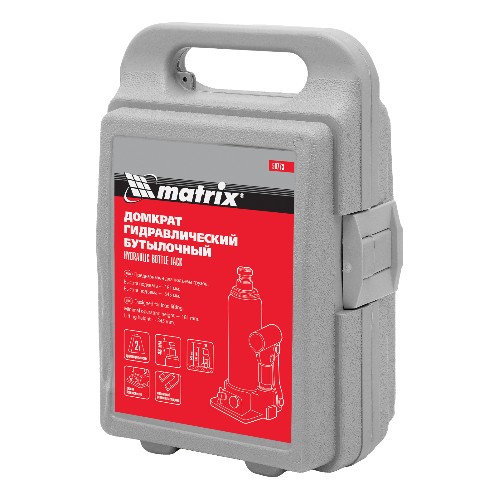 Домкрат гидравлический бутылочный, 2 т, h подъема 181-345 мм, в пластиковом кейсе Matrix