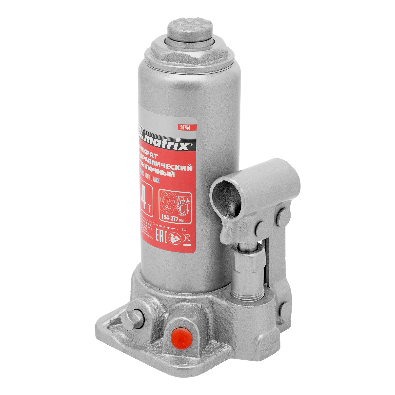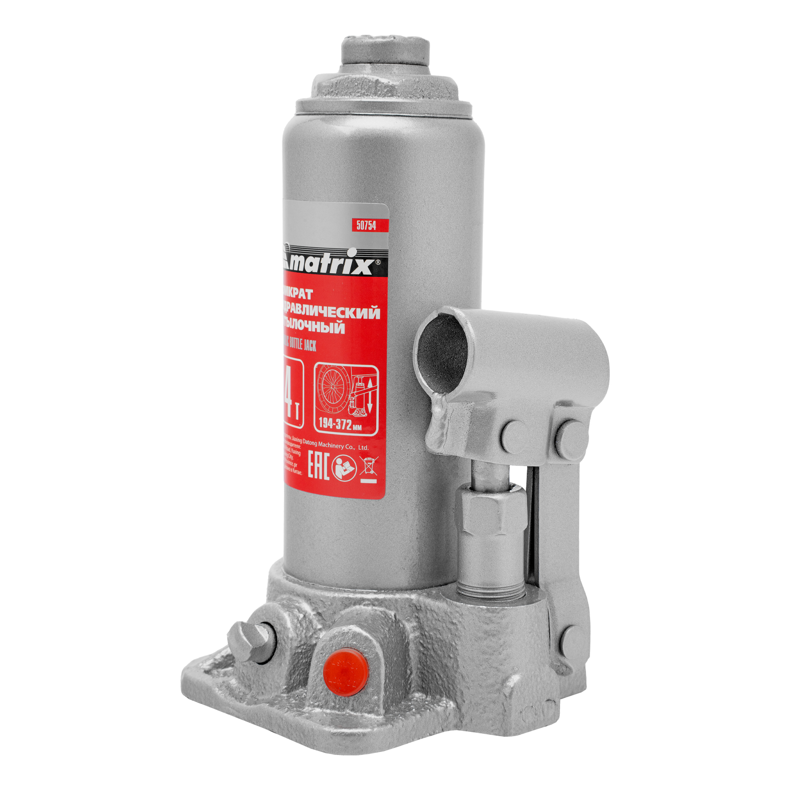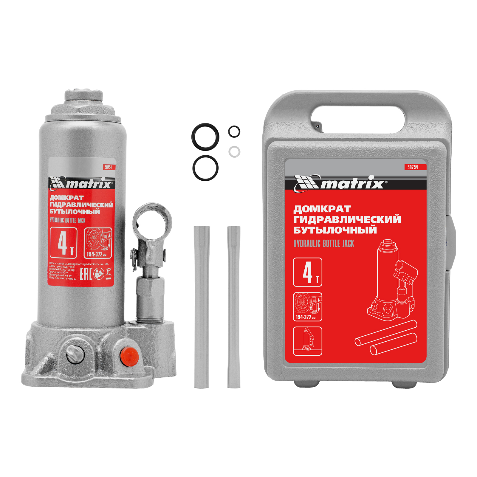 Домкрат гидравлический бутылочный, 4 т, высота подъема 194-372 мм, в пластиковый кейсе Matrix