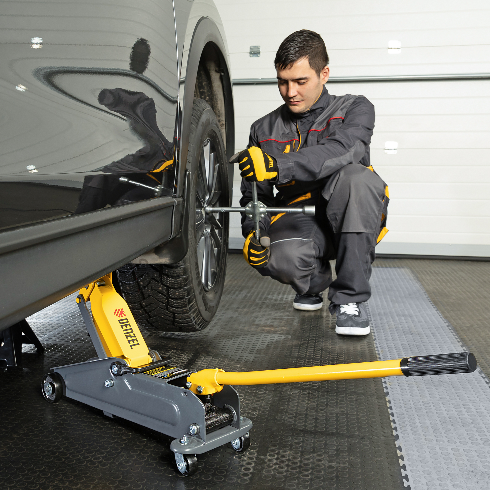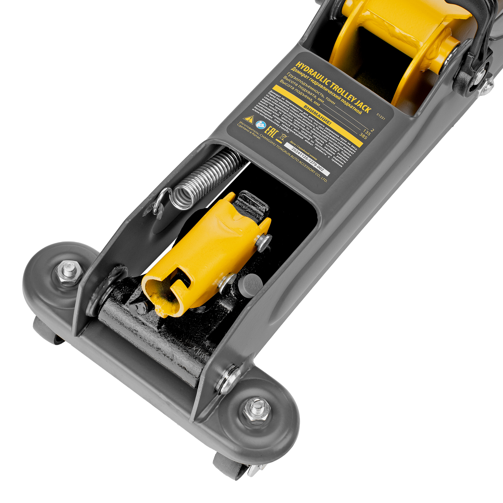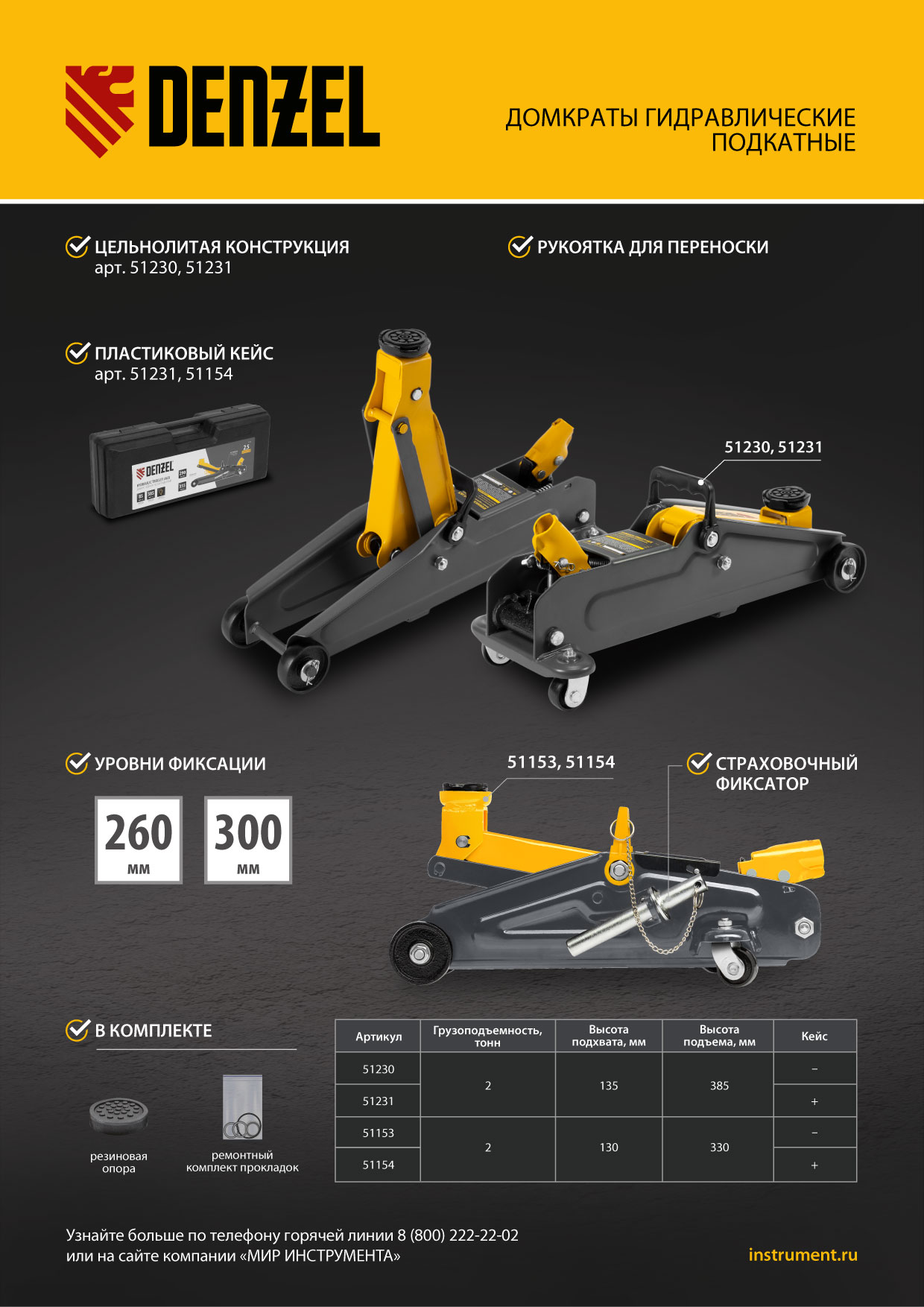 Гидравлический подкатной домкрат Denzel 51231 с высотой подхвата 135 мм, поставляющийся в пластиковом кейсе, предназначен для плавного подъема грузов массой до 2 т на высоту до 385 мм. Домкрат пригодится владельцам легковых автомобилей со стандартным клиренсом.