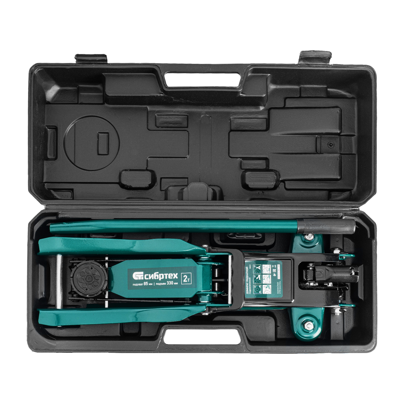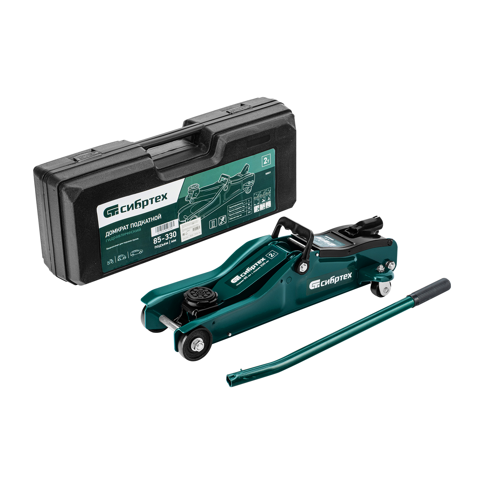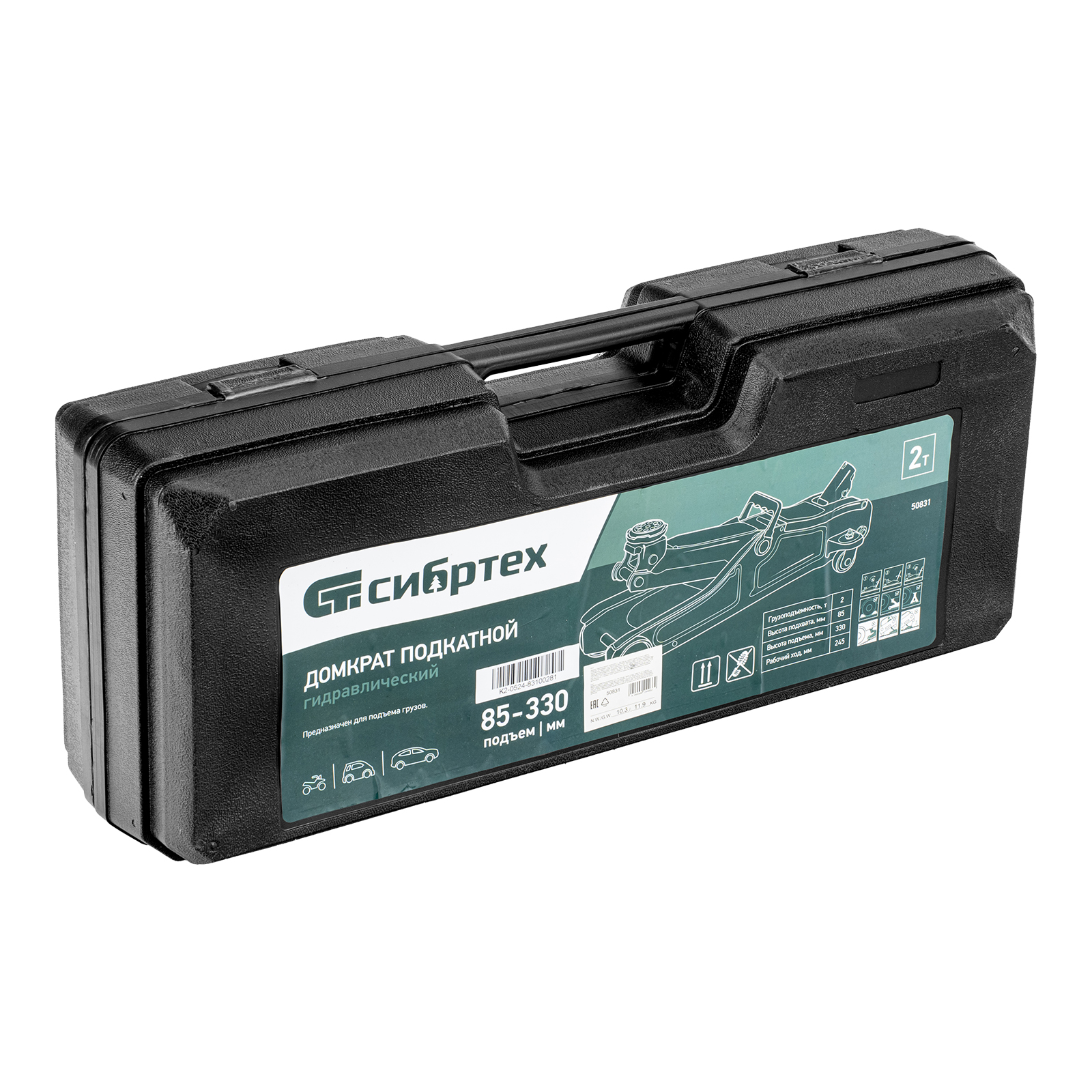 Гидравлический подкатной домкрат Сибртех 50831, поставляющийся в пластиковом кейсе, с высотой подхвата 85 мм, предназначен для подъема грузов массой до 2 т на высоту до 330 мм. Применяется для обслуживания автомобилей с низким клиренсом. Компактный домкрат подходит для самостоятельного использования автовладельцами.