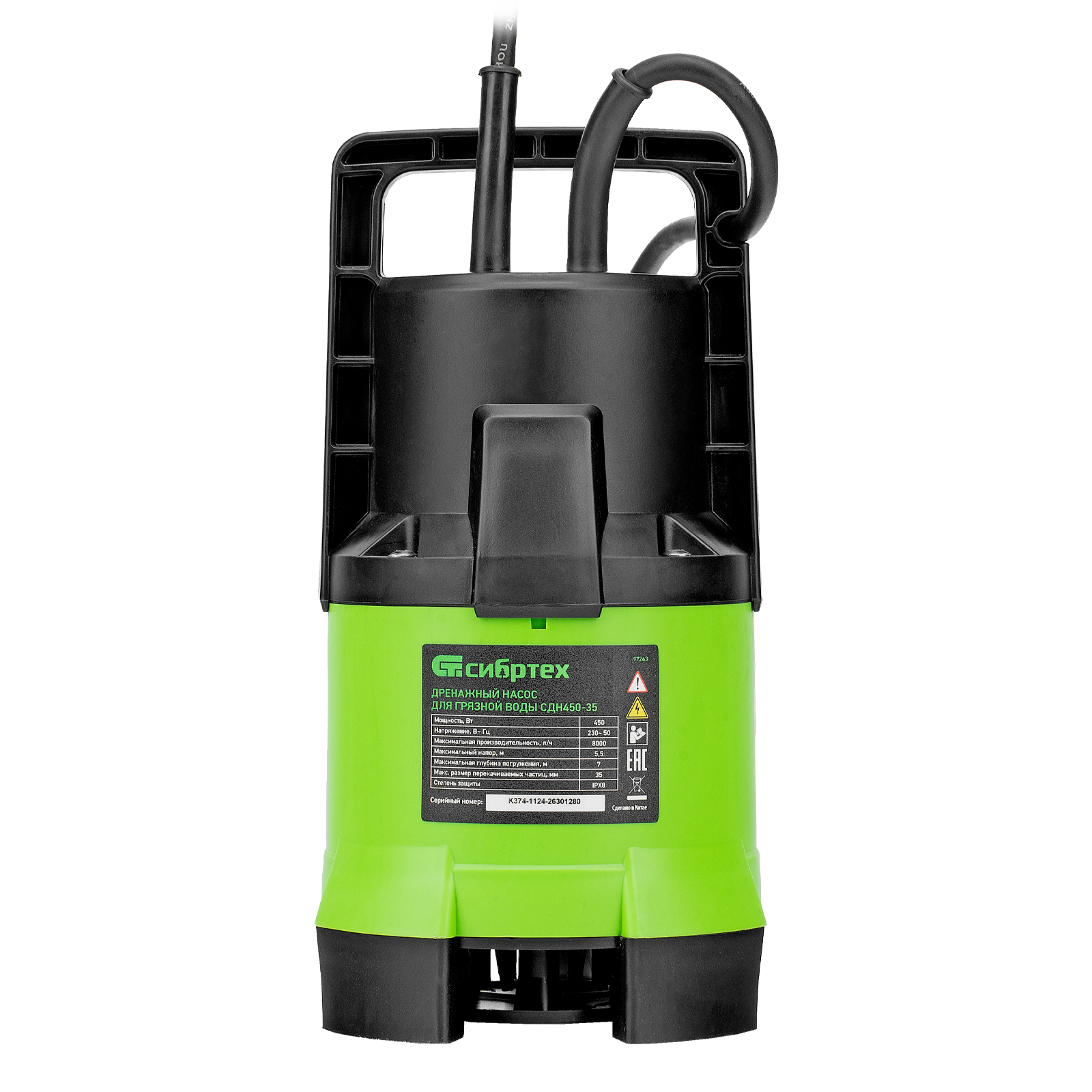 Дренажный насос Сибртех СДН450-35 97263 мощностью 450 Вт и производительностью 8000 л/ч обеспечивает напор до 5,5 м и предназначен для перекачивания жидких бытовых отходов и сточных вод, содержащих плавающие твердые включения размером до 35 мм. Насос питается от однофазной сети с напряжением 230 В, поэтому подходит для применения в частных домах, дачных коттеджах и на небольших строительных объектах