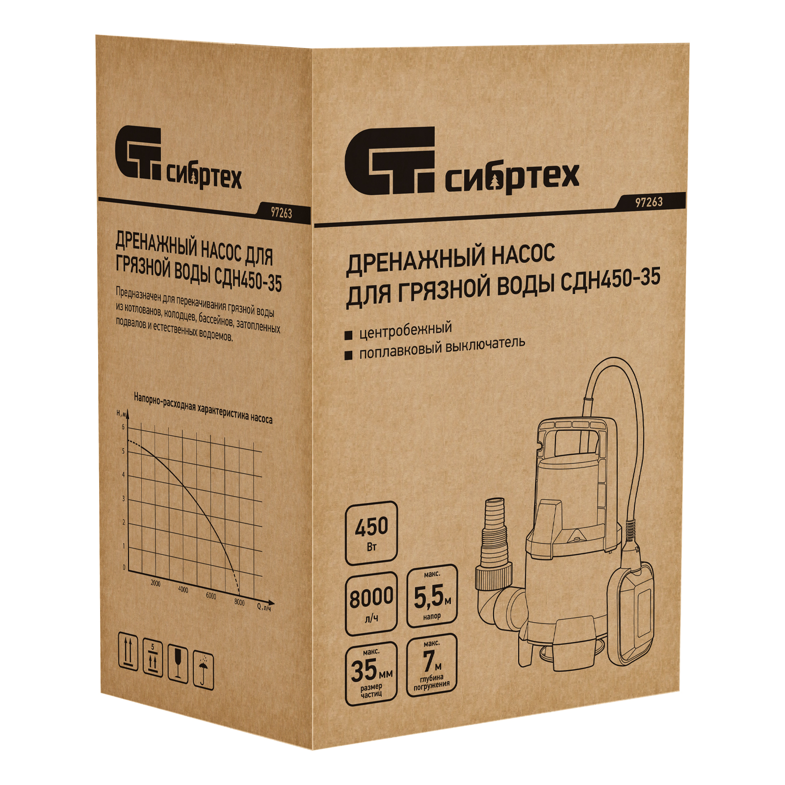Дренажный насос для грязной воды СДН450-35, 450 Вт, напор 5.5 м, 8000 л/ч Сибртех