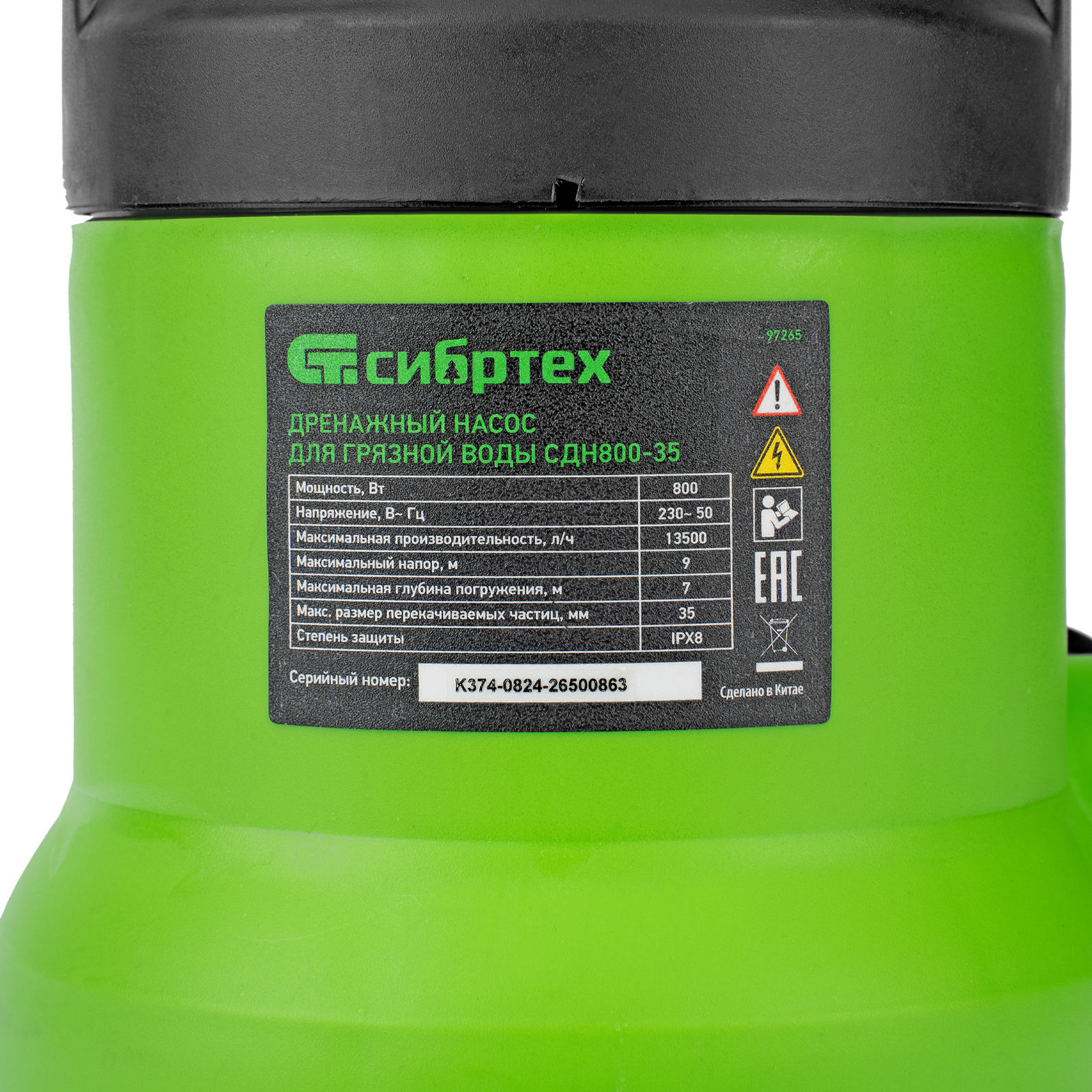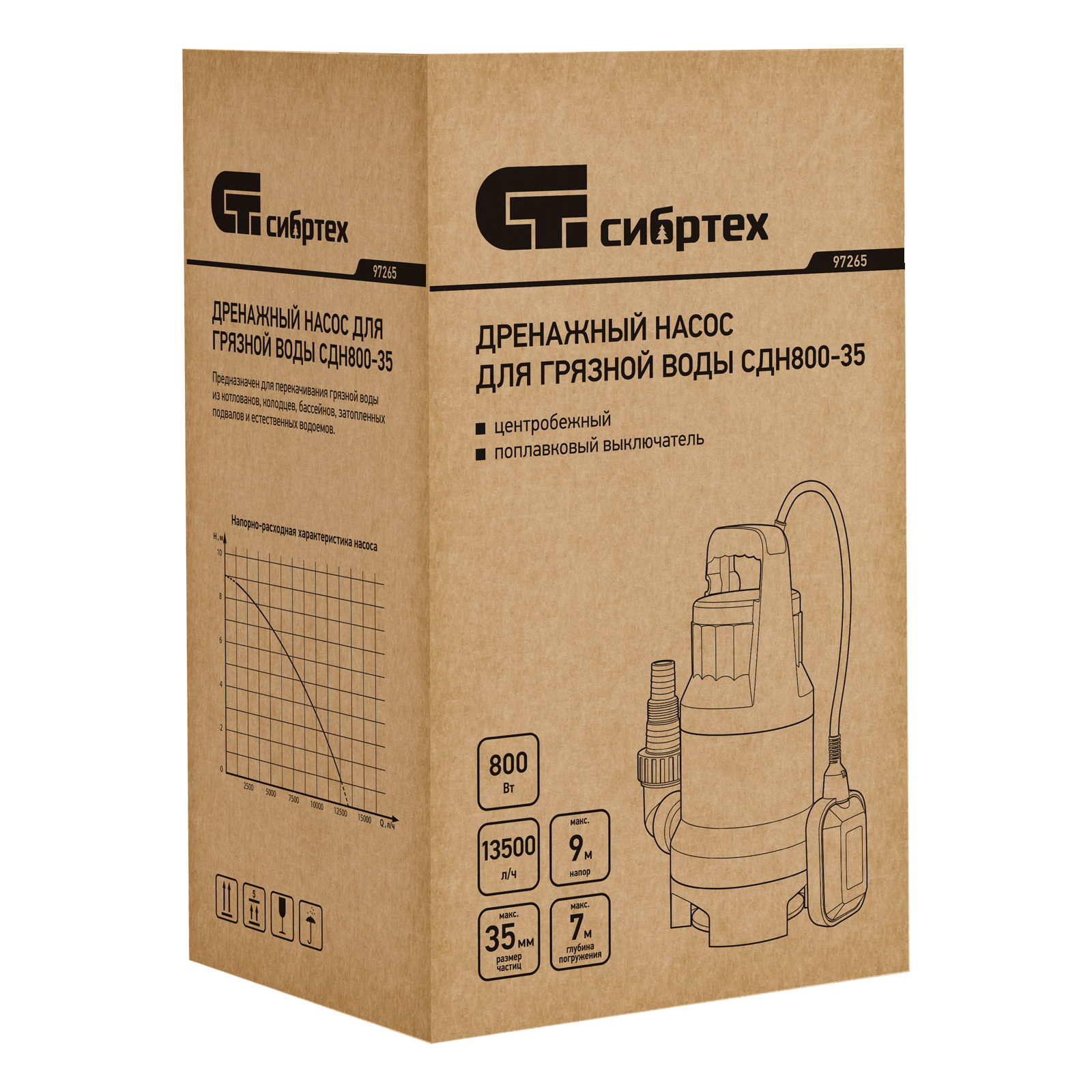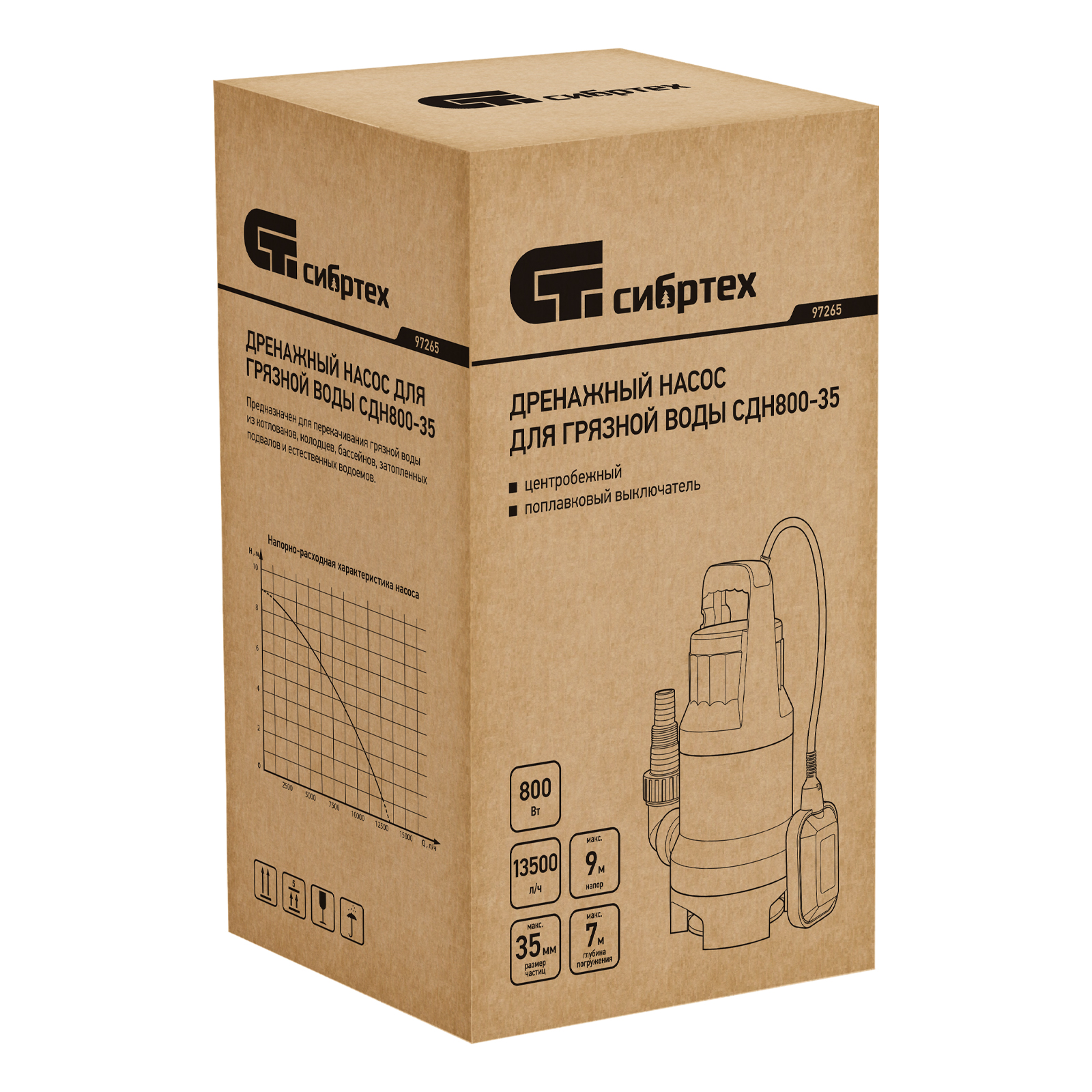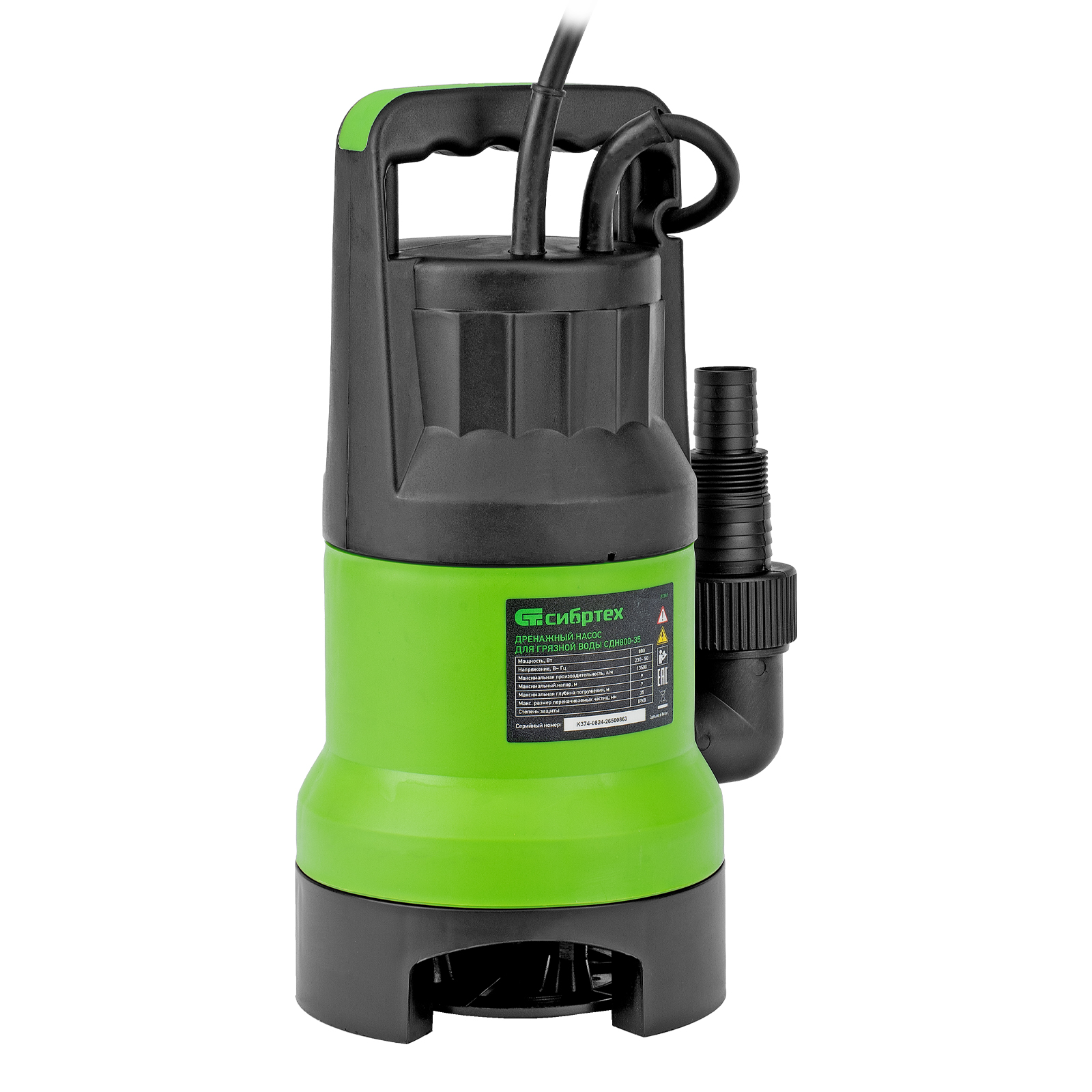 Дренажный насос для грязной воды СДН800-35, 800 Вт, напор 9 м, 13500 л/ч Сибртех