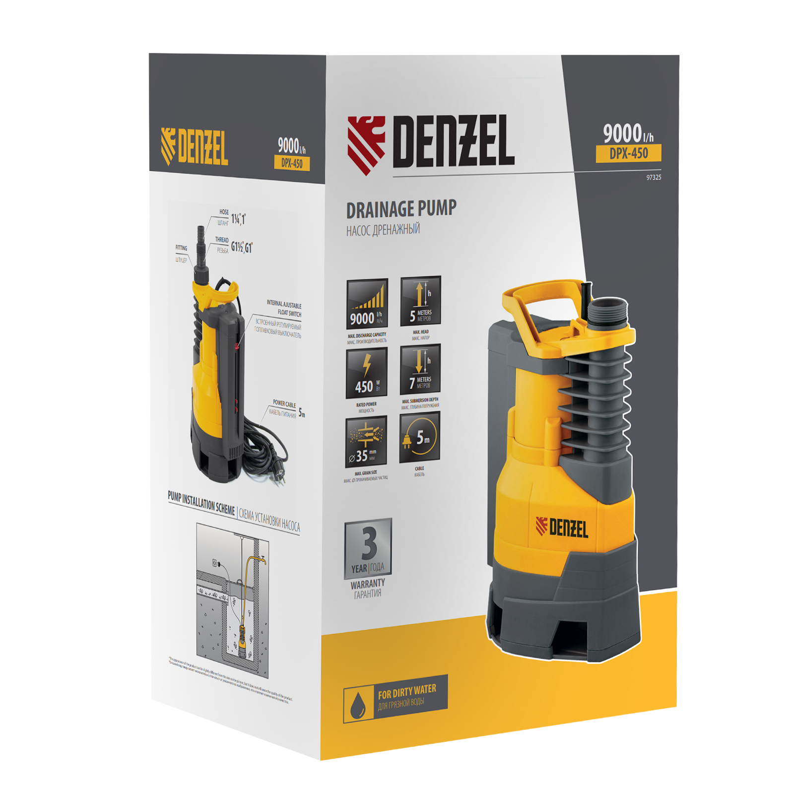 Дренажный насос DPХ450, 450 Вт, подъем 5 м, 9000 л/ч Denzel