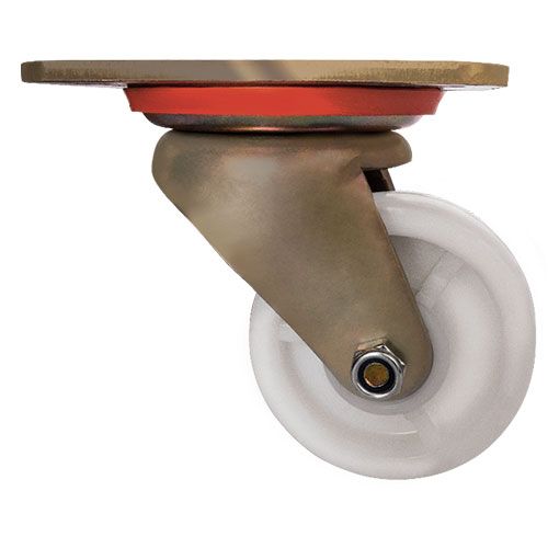 Данное большегрузное нейлоновое колесо предназначено для установки на передвижное оборудование, используемое в пищевой, химической и фармацевтической промышленности. Оно не боится воздействия влаги и различных химически агрессивных веществ, отличается низким коэффициентом трения и высокой износостойкостью. Шариковый подшипник в оси обеспечивает плавное вращение. Поворотный кронштейн изготовлен из оцинкованной стали, тип крепления — платформа с отверстиями под болты. Максимальная грузоподъемность модели — 400 кг.