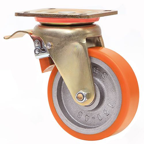 Большегрузное колесо EMES ED01 VBP 55 F имеет поворотный кронштейн с ножным тормозом. Полиуретановая шинка устойчива к истиранию и механическим повреждениям. Максимальная грузоподъемность колесной опоры составляет 130 кг, общая высота — 80 мм. Литой обод из чугуна хорошо распределяет нагрузку. Модель подходит для установки на платформенные тележки, передвижное большегрузное оборудование.