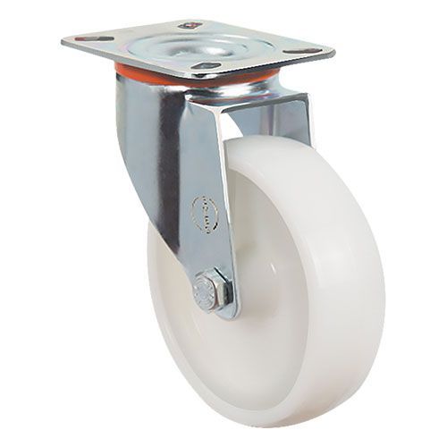 Колесная опора EMES EM01 ZKZ 125 устанавливается на платформенные тележки для пищевой промышленности, передвижное медицинское оборудование и технику. Нейлоновый обод хорошо распределяет нагрузку. Поворотный кронштейн изготовлен из оцинкованной стали. Максимальная грузоподъемность модели составляет 160 кг. Рабочий температурный диапазон — от -20 до +70 °С.