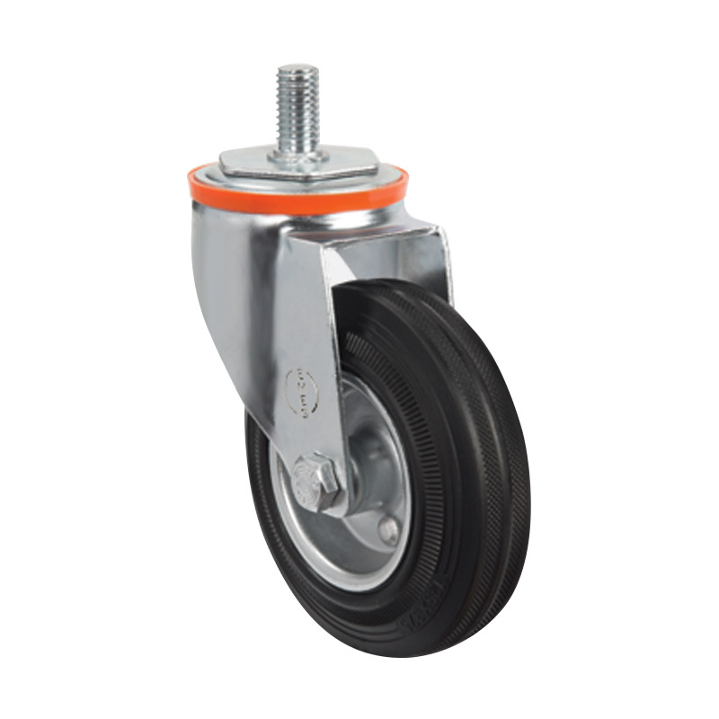 Грузоподъемность данного промышленного колеса составляет 110 кг, диаметр — 125 мм. Контактный слой изготовлен из литой черной резины, обод и кронштейн — из оцинкованной стали. Роликовый подшипник в оси обладает высокой стойкостью к радиальным нагрузкам. Модель подходит для установки на различное складское и строительное оборудование, контейнеры ТБО, может использоваться на поверхностях с уклонами и неровностями, во влажной среде.