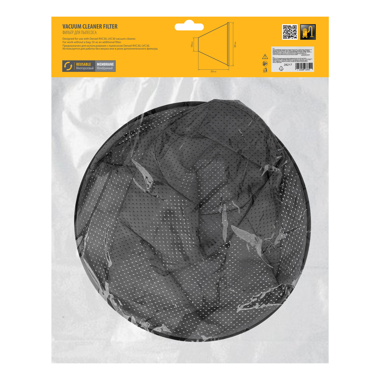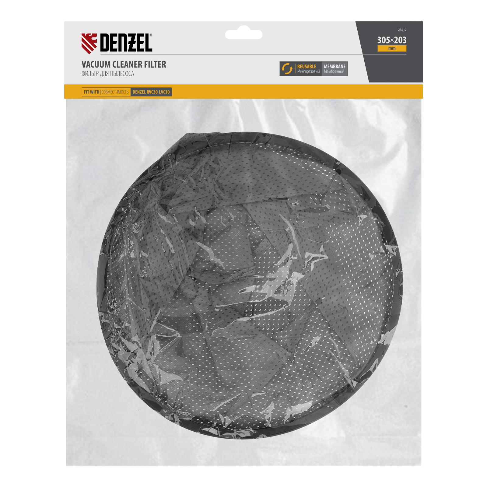 Мембранный тканевый фильтр Denzel 28217 совместим со строительными пылесосами RVC30 (28203), LVC30 (28293). Устанавливается в бак пылесоса и служит для дополнительной фильтрации, а также позволяет проводить сухую уборку без использования мешка.
