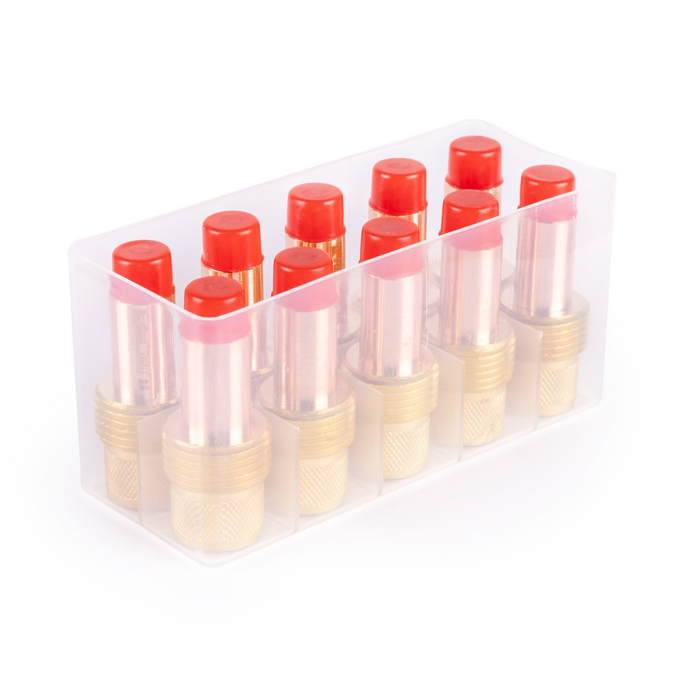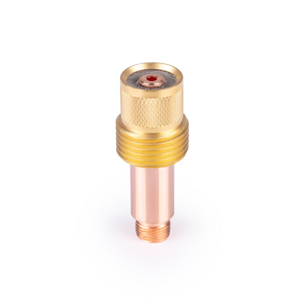 Держатель служит для крепления цанги 2,4 мм в TIG горелке. Через имеющиеся в устройстве отверстия аргон в процессе сварки поступает к сварочной ванне для защиты от воздействия кислорода. Газовая линза обеспечивает равномерность потока защитного газа по всей площади пятна контакта. Устройство служит для предотвращения появления побежалости или задействуется при невысоком качестве аргона.