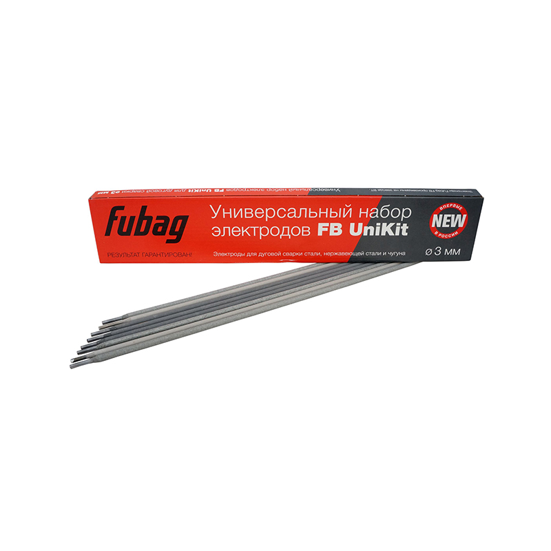Диаметр всех электродов составляет 3,0 мм. Общий вес упаковки 0,9 кг. Рекомендуемая сила тока при сварке: FB 46 - 80-150А, FB INOX – 50-90А, FB CAST – 65-80А. Набор электродов FUBAG FB UniKit совместим с различными источниками питания и доступен для заказа в .