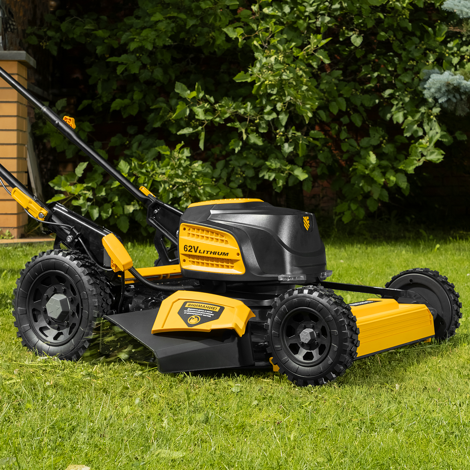 - Легкое управление — благодаря независимому приводу на задние колеса включенную косилку не нужно толкать.