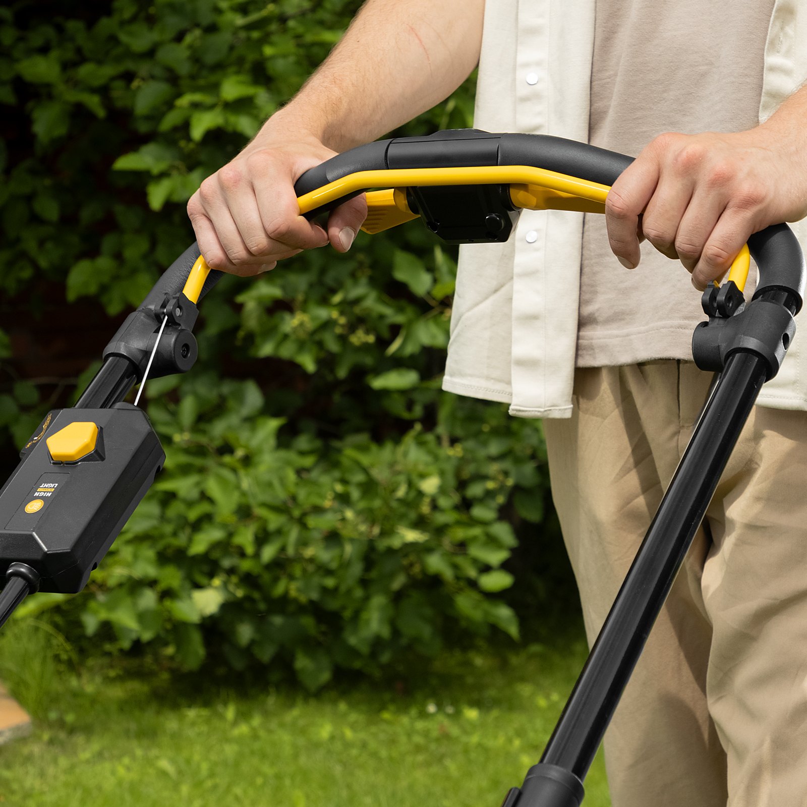 - 6 уровней скашивания — высота травяного покрова регулируется одним рычагом в диапазоне 30-95 мм.