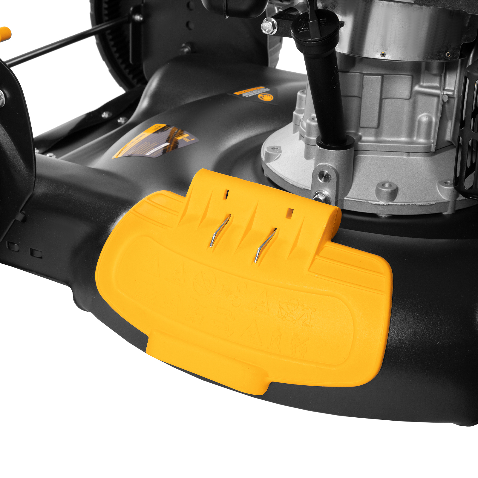 - Быстрая очистка — удалять грязь и остатки травы из внутренних лопастей нетрудно, т.к. косилка оборудована штуцером для подключения шланга.