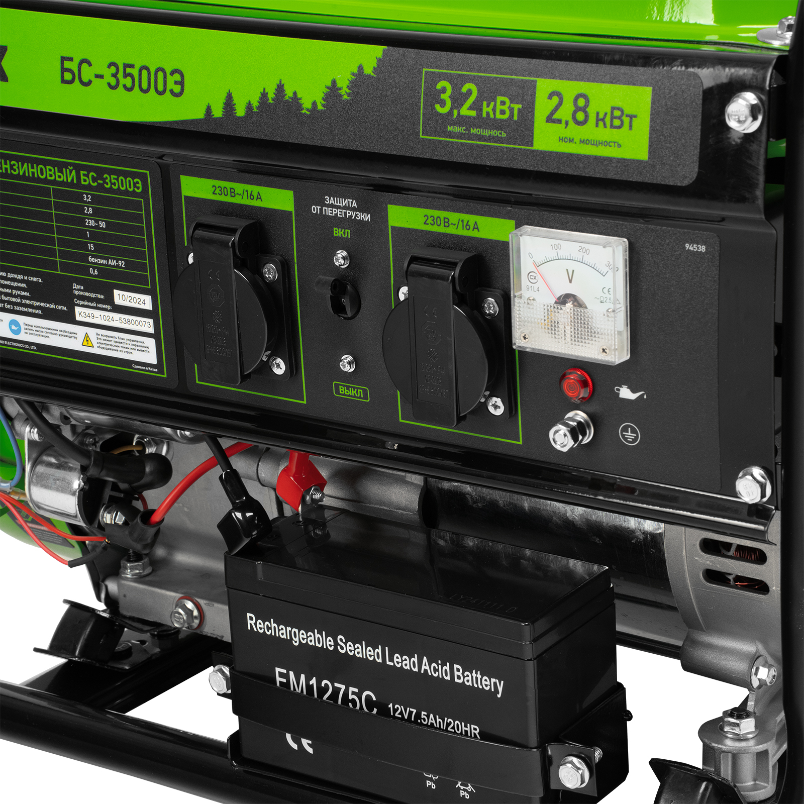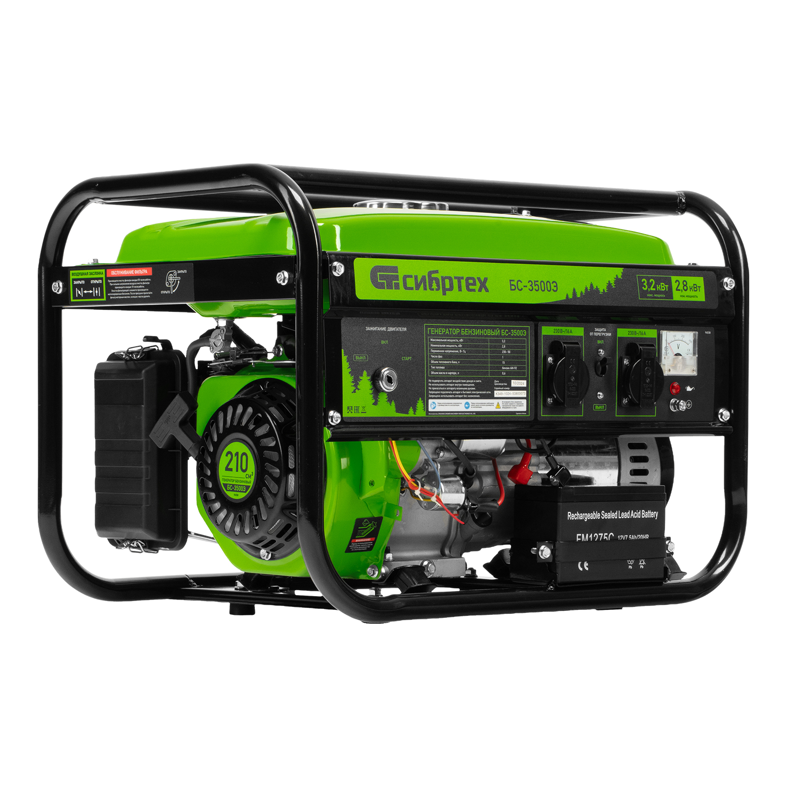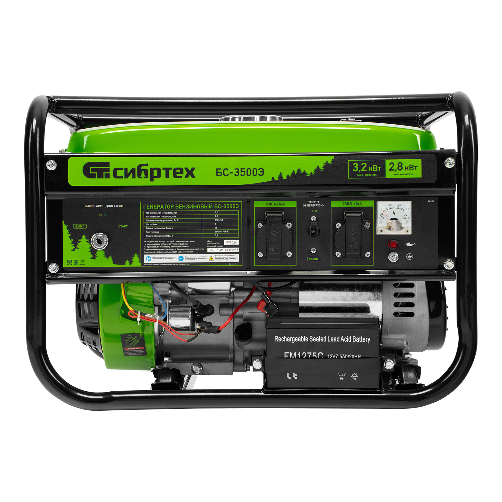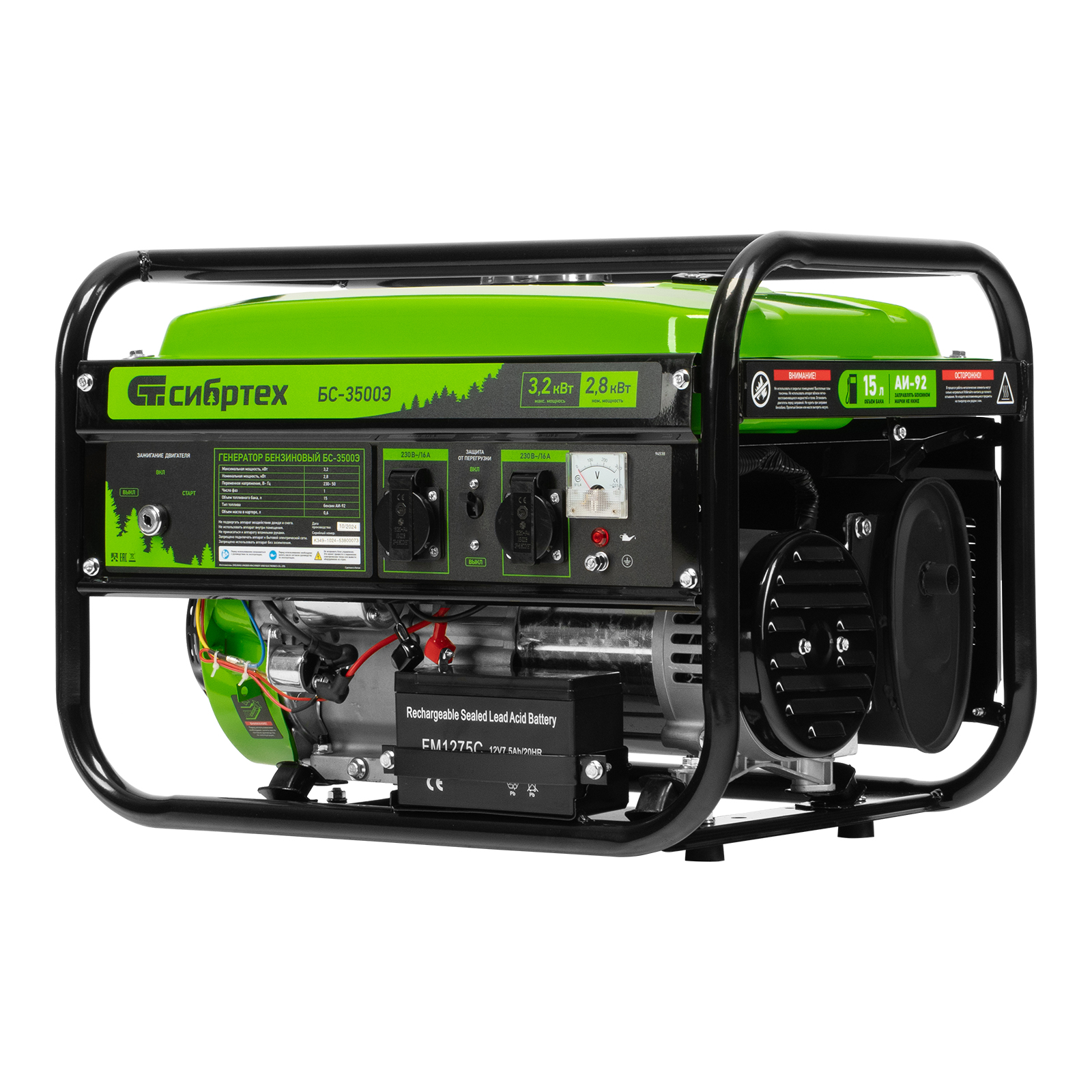 Бензиновый генератор Сибртех БС-3500Э 94538 выходной мощностью 3,2 кВт, с электростартером и баком объемом 15 л, поддерживает напряжение 230 В и предназначен для автономного электроснабжения в условиях отсутствия бытовой электросети. Для подключения потребителей предусмотрены 2 розетки 230 В/16 А. Автономный регулятор напряжения AVR позволяет подключать чувствительные приборы без риска их поломки. Генератор пригодится на дачном участке.