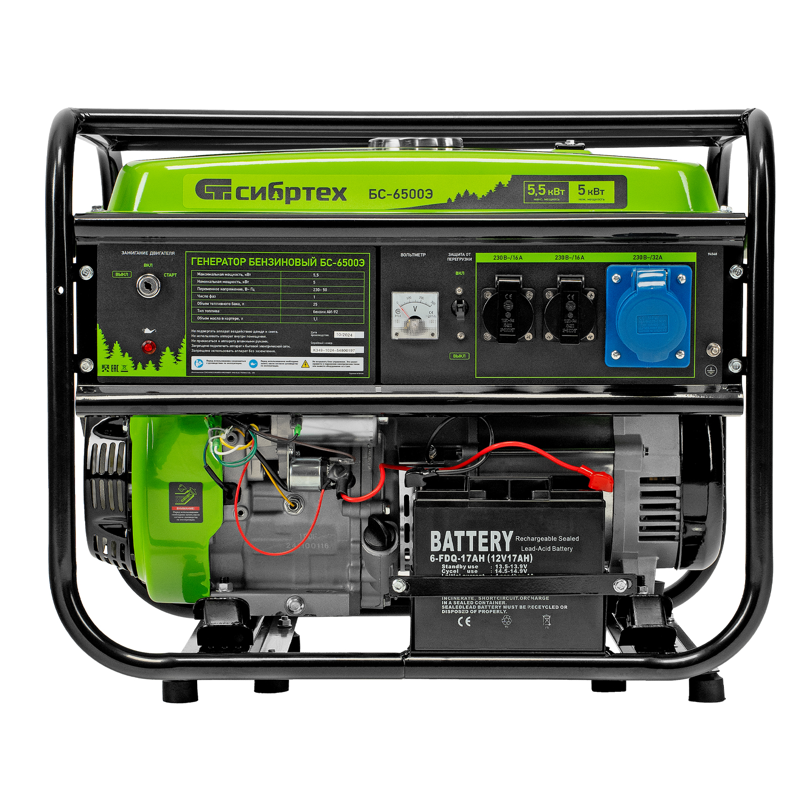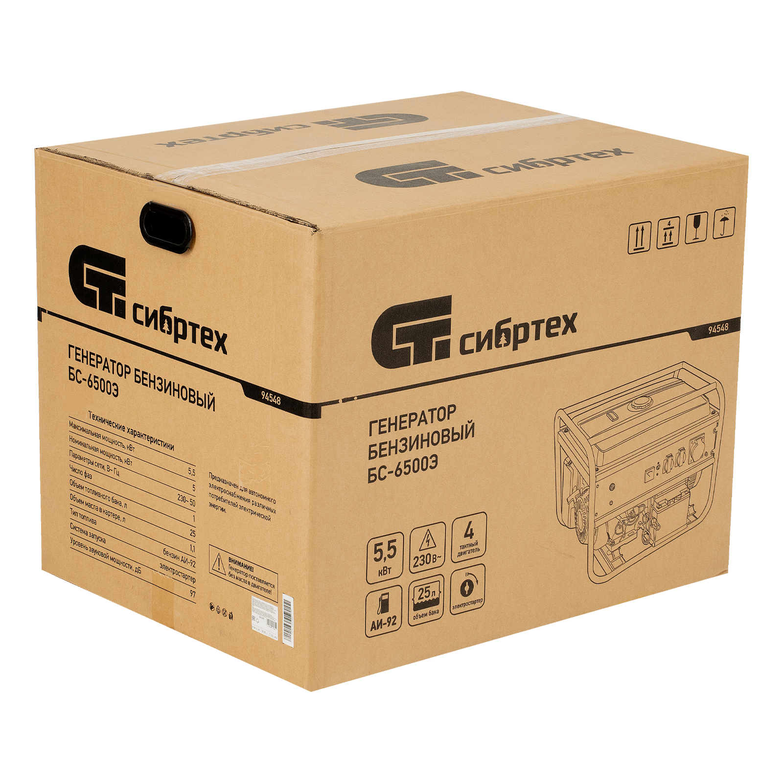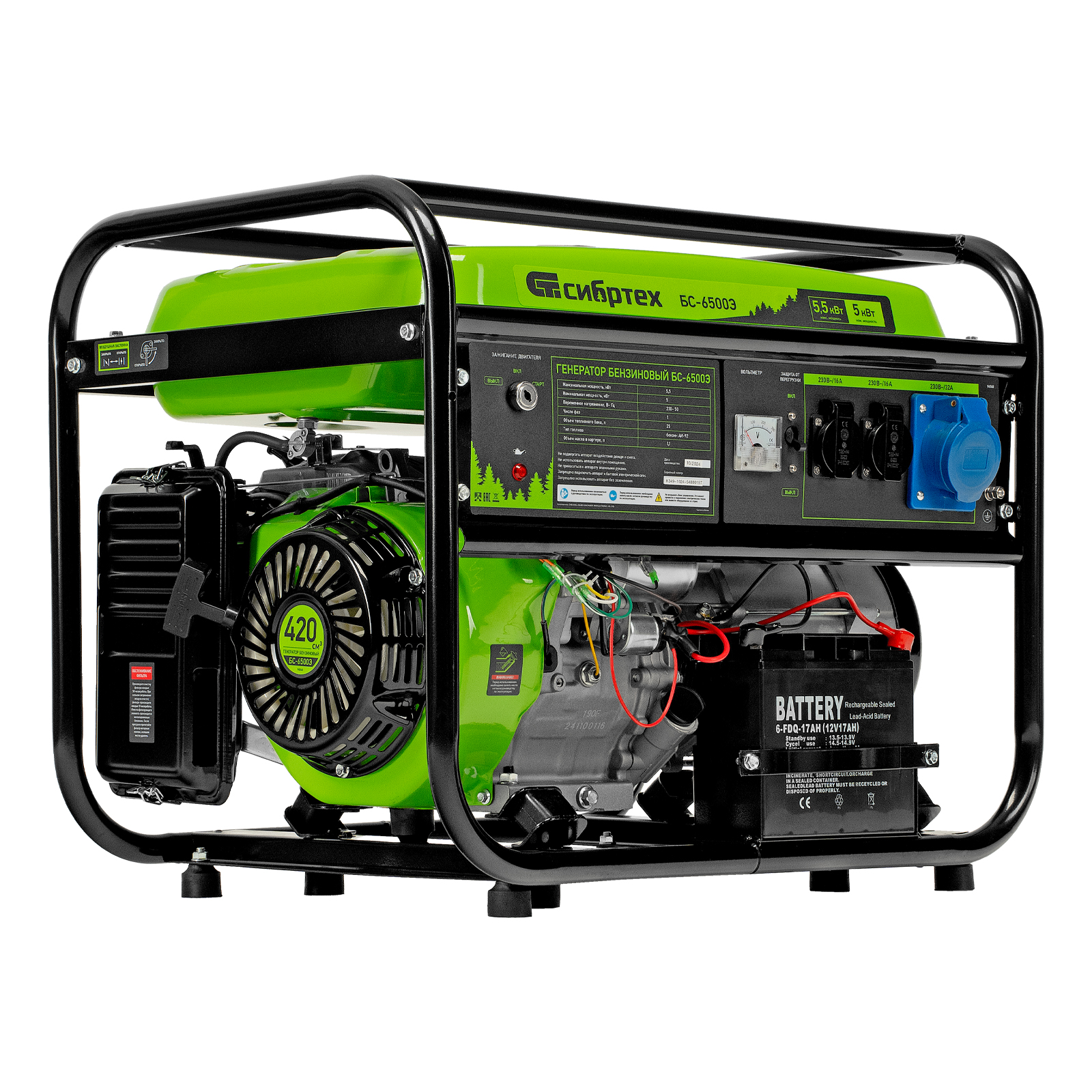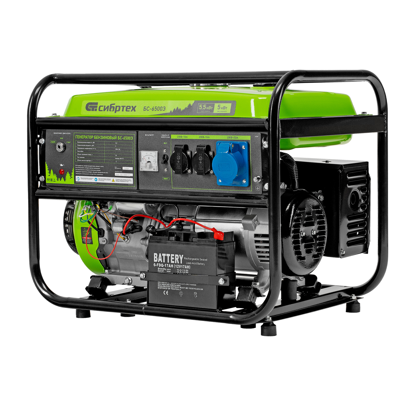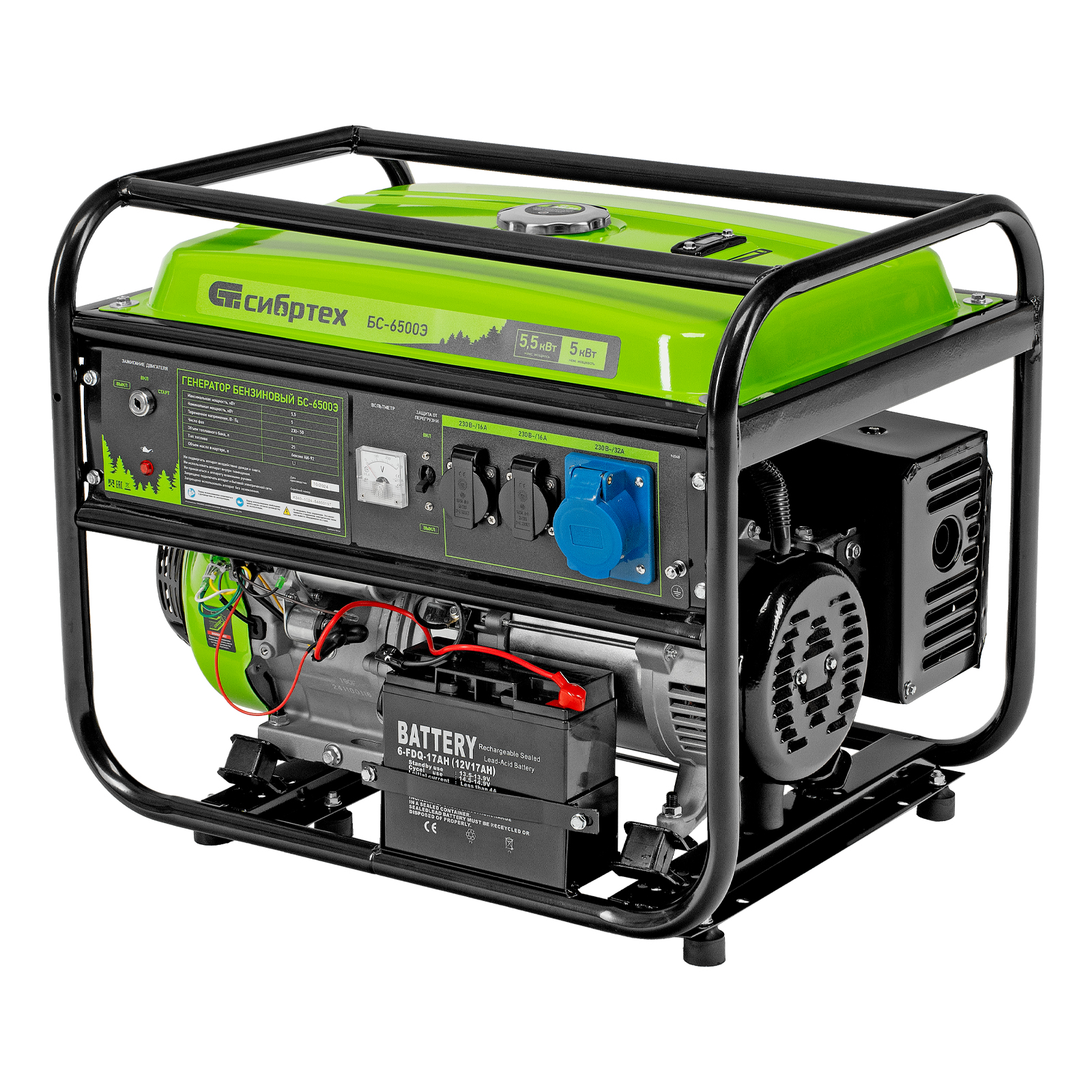 Бензиновый генератор Сибртех БС-6500Э 94548 максимальной мощностью 5,5 кВт, с 4-тактным двигателем, электростартером и баком объемом 25 л, выдает напряжение 230 В и используется для электроснабжения на даче, на строительной площадке, в магазине, в мастерской или гараже. Мощности хватает для обеспечения работы электроинструмента или одновременного подключения 4 ламп накаливания, телевизора, плиты и холодильника. Благодаря электростартеру запуск генератора осуществляется одним поворотом ключа.