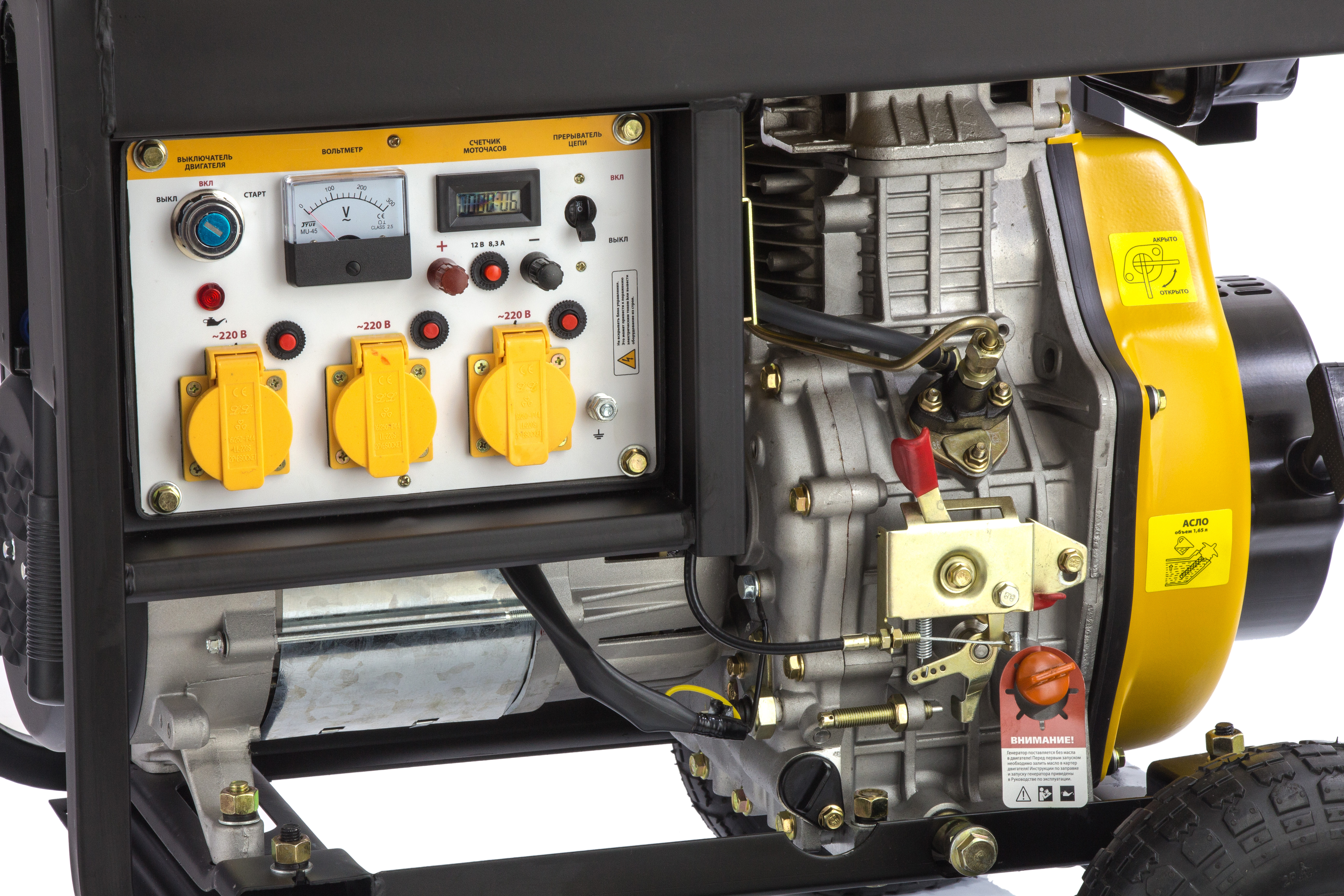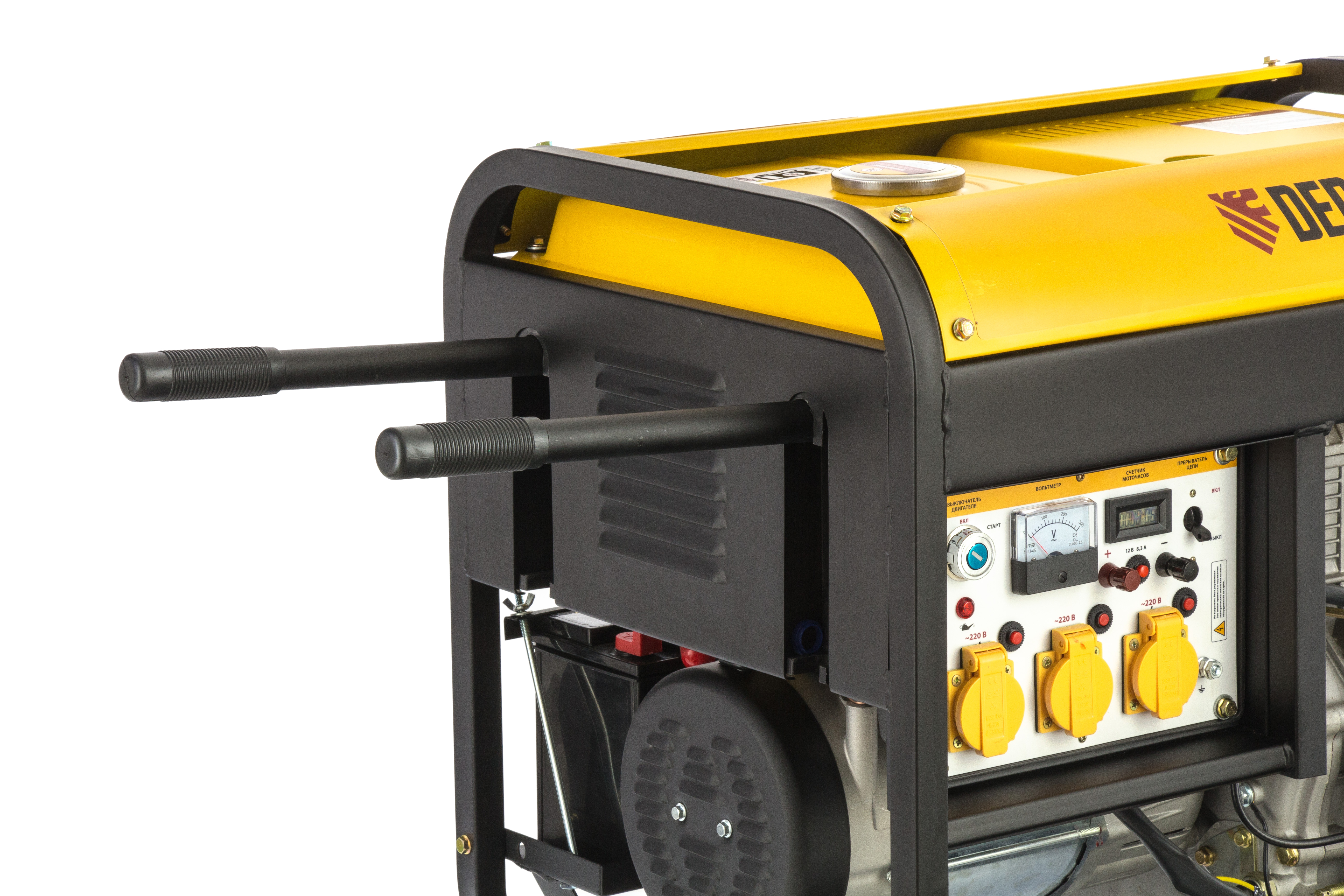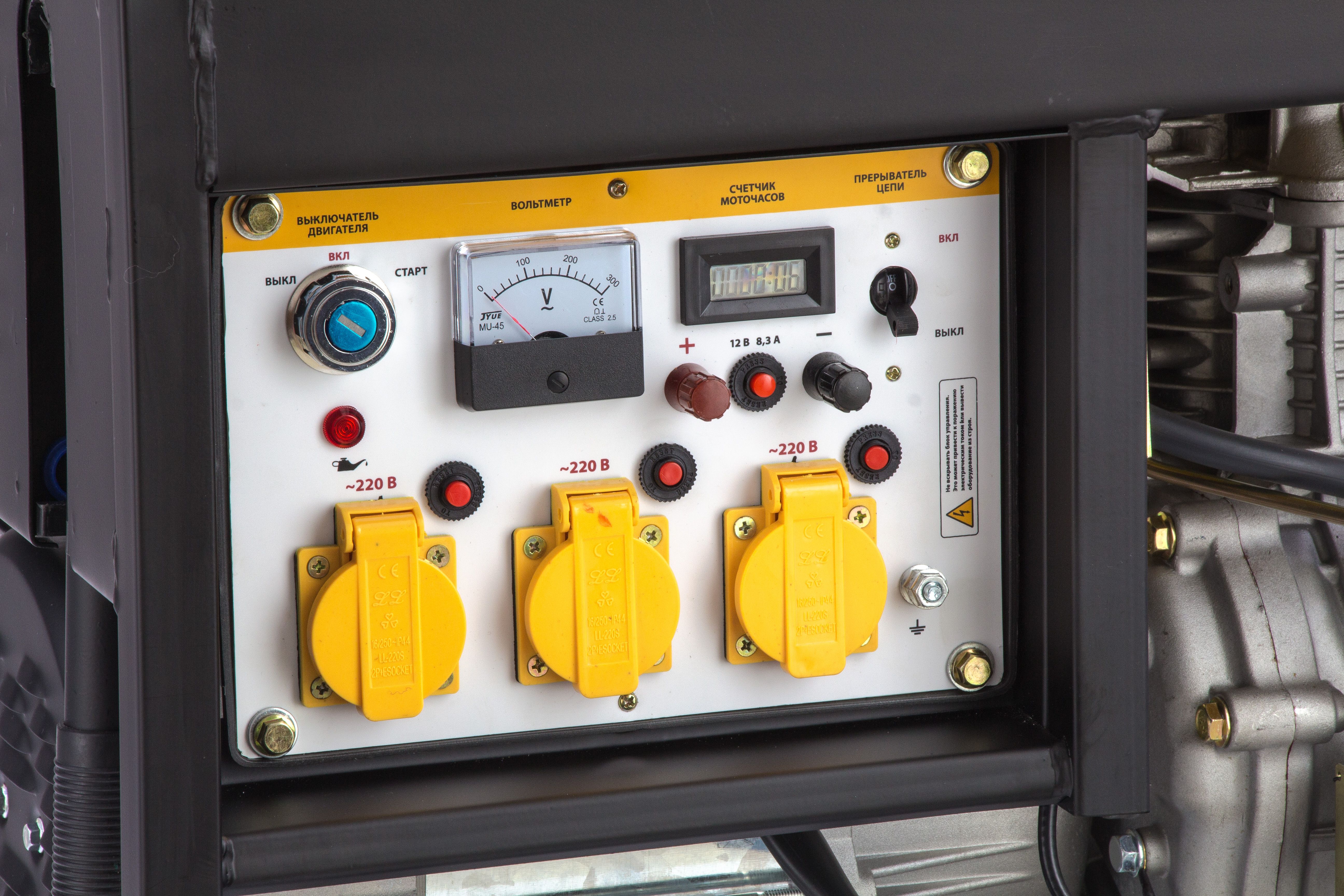 - Удобный контроль работы — счетчик моточасов отображает отработанное время, вольтметр позволяет отслеживать напряжение в сети, а индикатор топлива помогает своевременно заправлять бак.