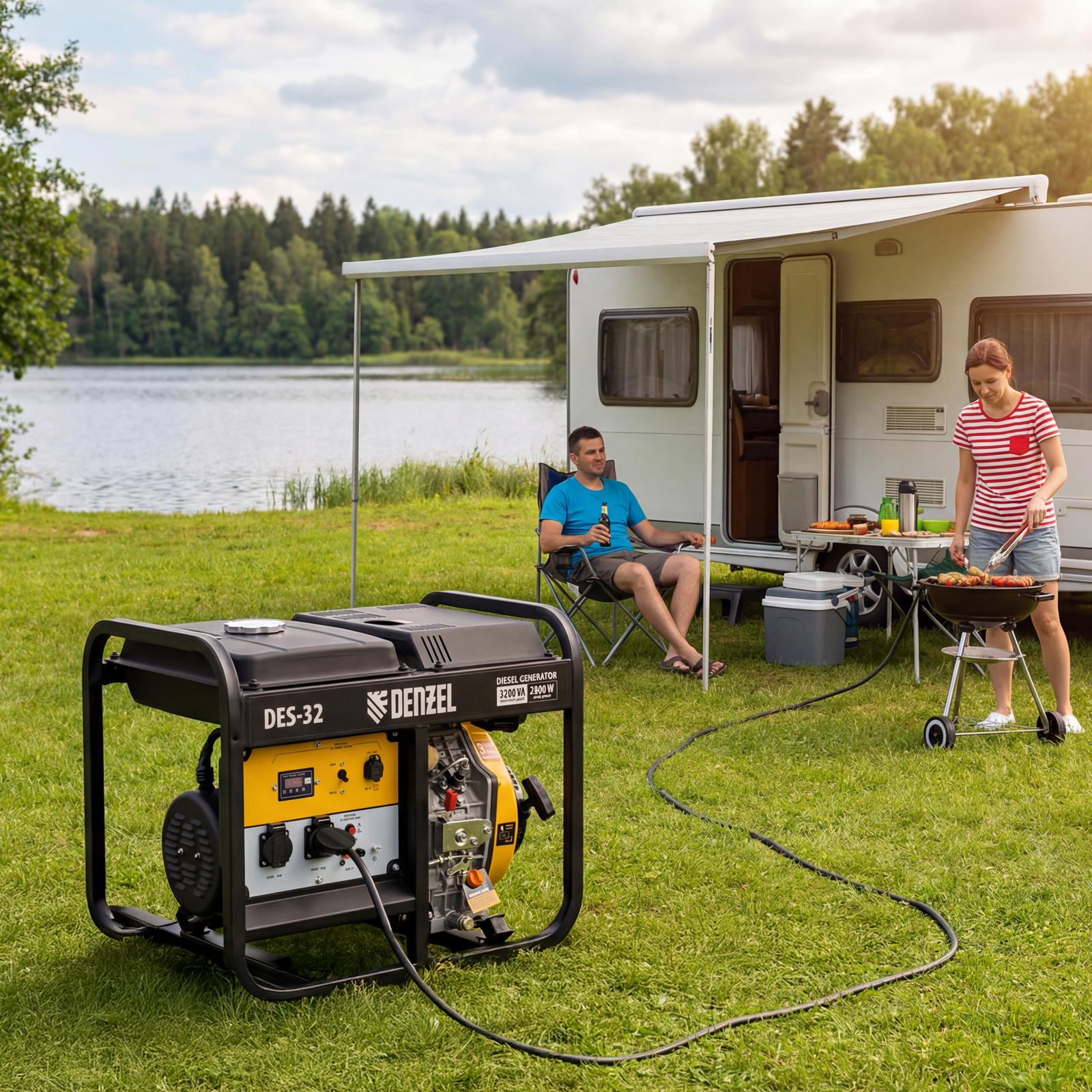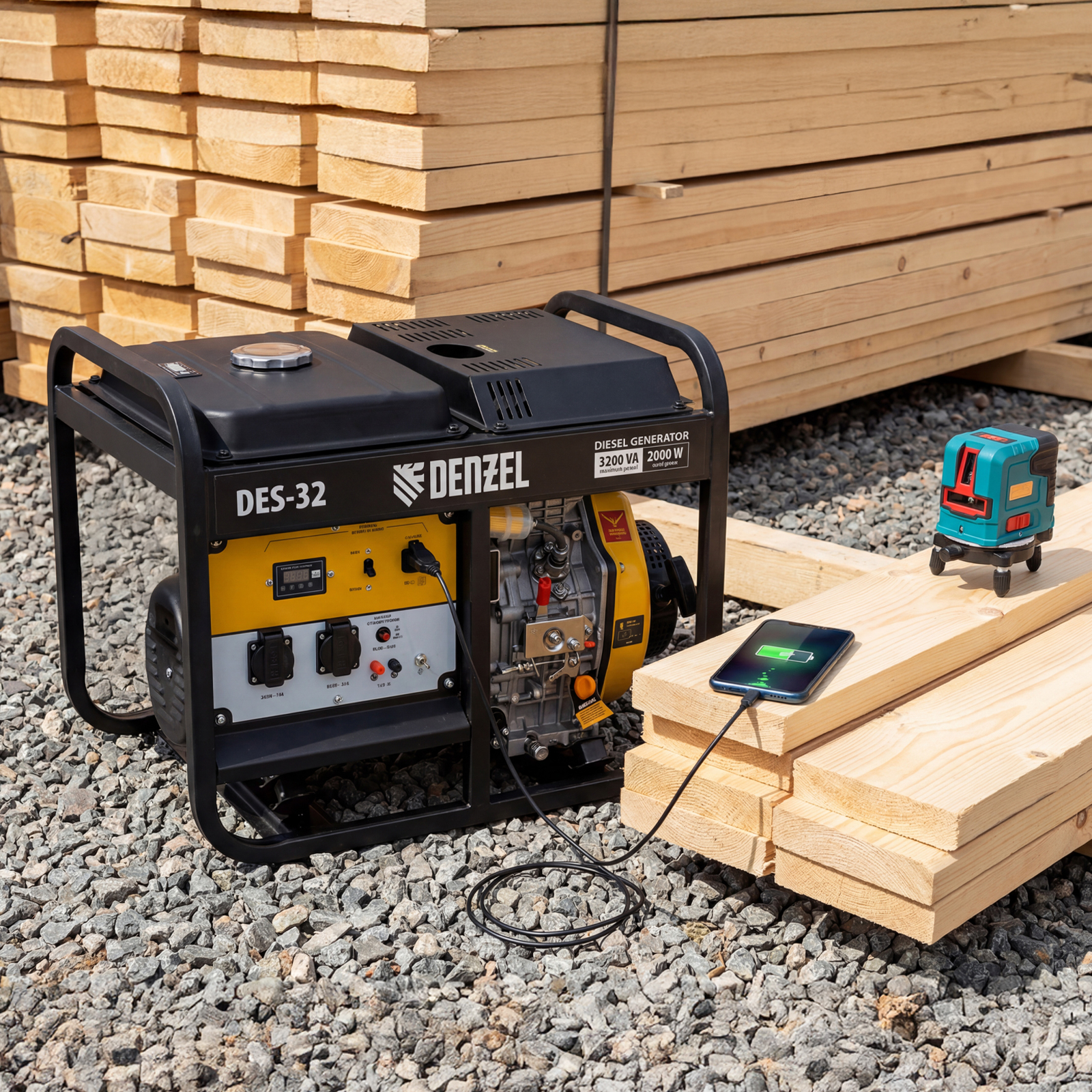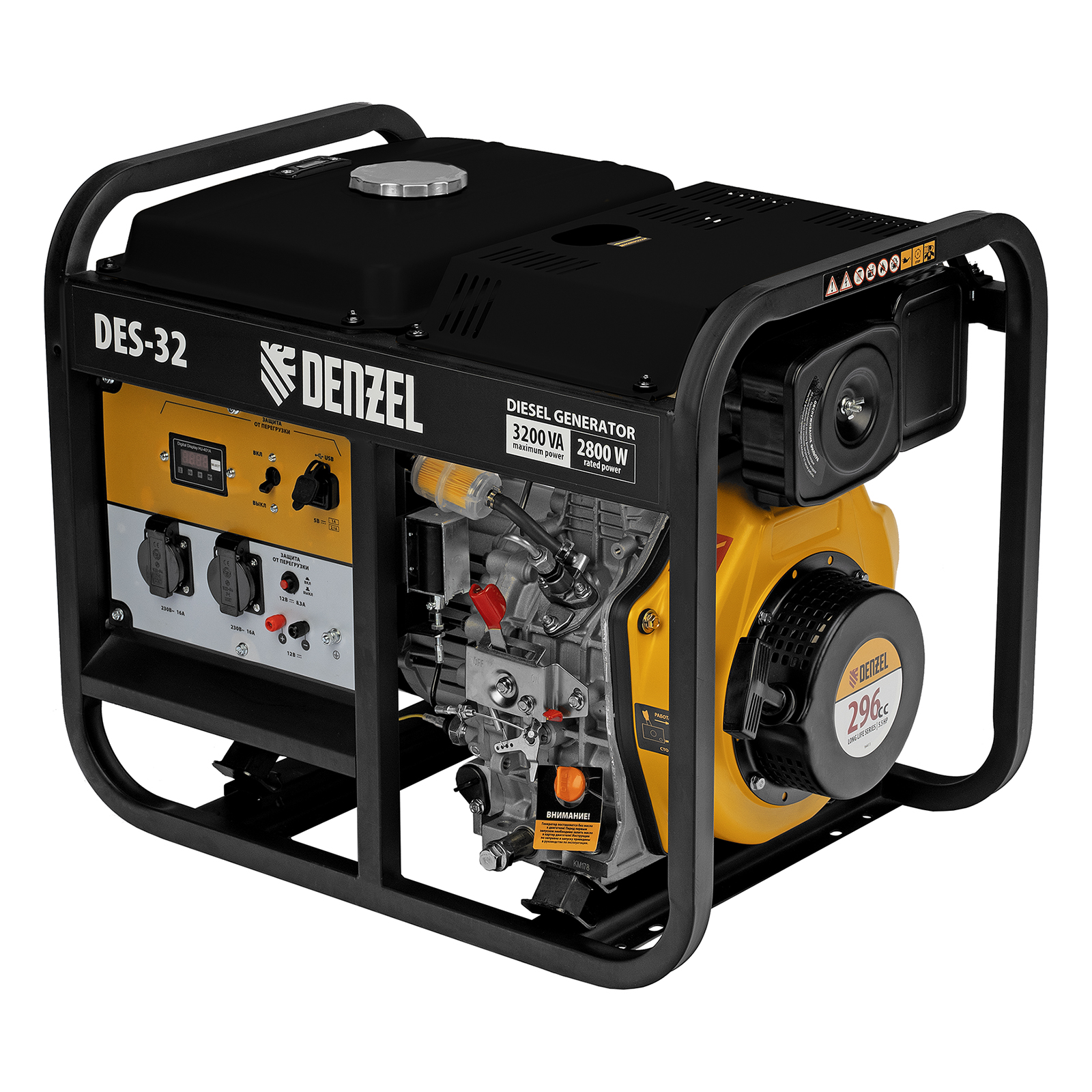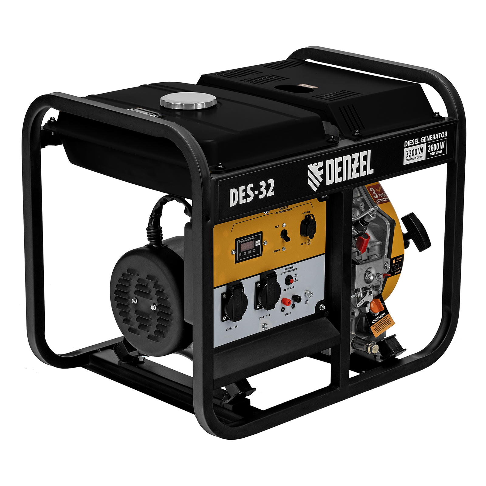 Генератор дизельный Denzel DES-32 94411 с объемом топливного бака 11 л, с ручным стартером, имеет максимальную выходную мощность 3,2 кВт и поддерживает напряжение в сети 230 В. Используется для снабжения энергией потребителей однофазного тока (осветительных приборов, бытовой техники, электроинструмента) при отсутствии доступа к стационарному источнику питания. Для подключения электроприборов служат 2 розетки 230 В/16 А. Клеммы постоянного тока 12 В позволяют заряжать автомобильные аккумуляторы, а двойной выход USB 5 В предназначен для подключения мобильных устройств (планшетов, смартфонов и т. д.). Генератор пригодится в загородном доме.