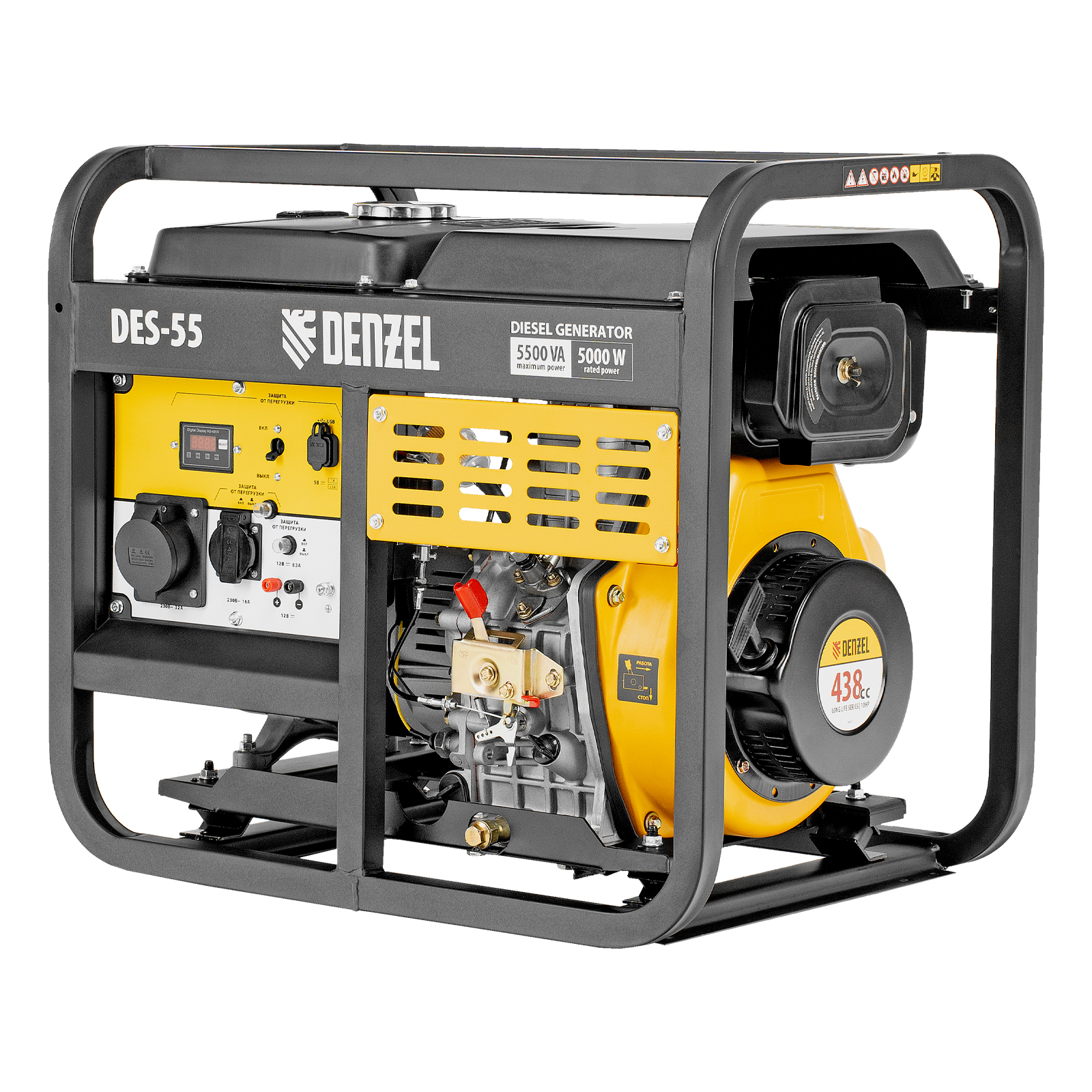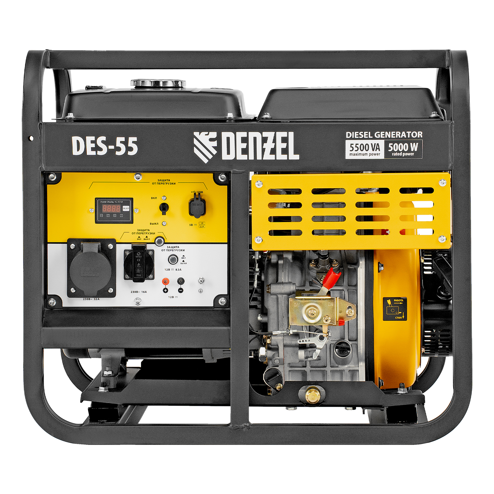Генератор дизельный Denzel DES-55 94413 с объемом топливного бака 11 л, с ручным стартером, имеет максимальную выходную мощность 5,5 кВт и поддерживает напряжение в сети 230 В. Используется для снабжения энергией потребителей однофазного тока (осветительных приборов, бытовой техники, электроинструмента) при отсутствии доступа к стационарному источнику питания. Для подключения электроприборов служат 2 розетки: 230 В/16 А и 230 В/32 А. Клеммы постоянного тока 12 В позволяют заряжать автомобильные аккумуляторы, а двойной выход USB 5 В предназначен для подключения мобильных устройств (планшетов, смартфонов и т. д.). Генератор пригодится на строительной площадке и в загородном доме.