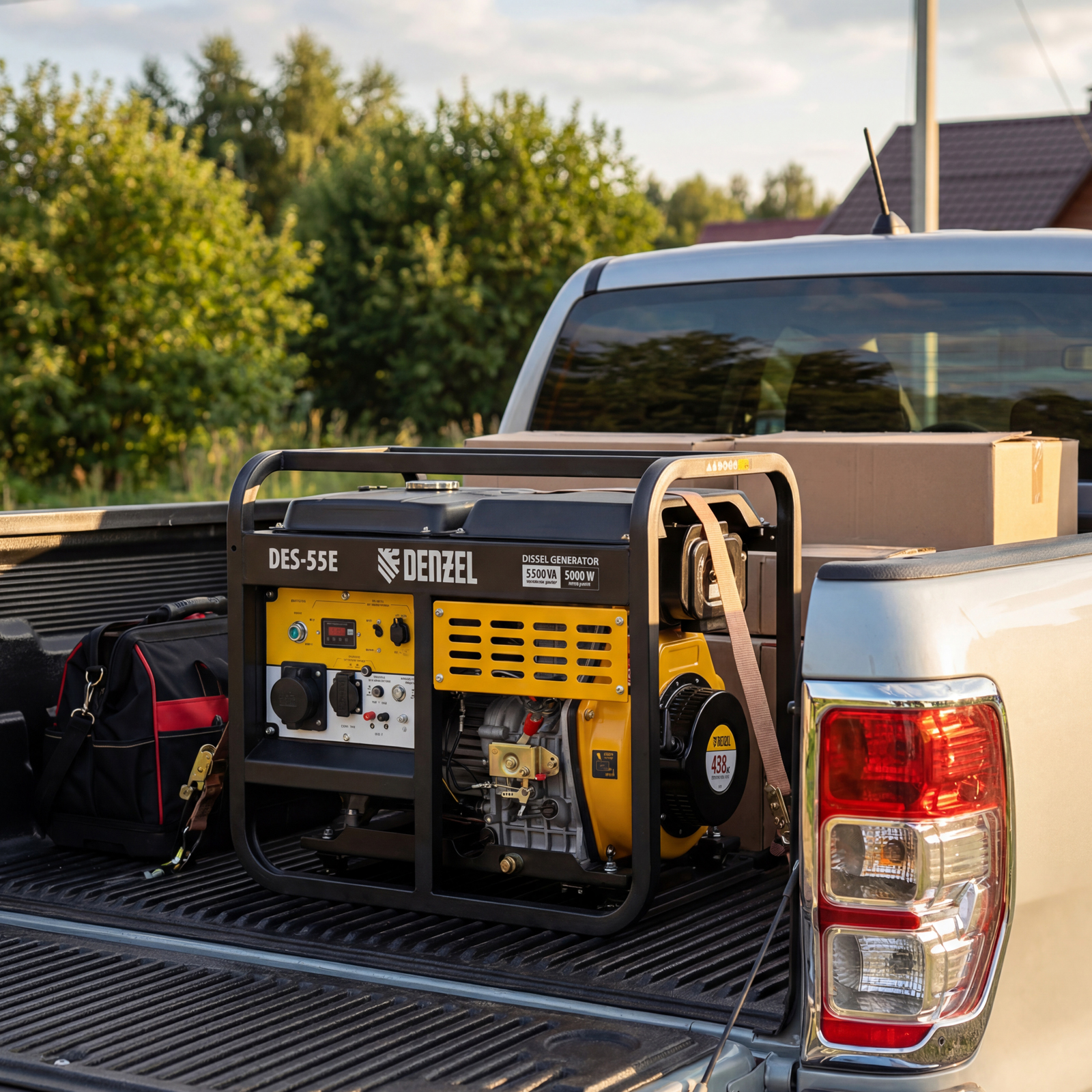 Генератор дизельный Denzel DES-55E 94414 с объемом топливного бака 11 л, с электростартером, имеет максимальную выходную мощность 5,5 кВт и поддерживает напряжение в сети 230 В. Используется для снабжения энергией потребителей однофазного тока (осветительных приборов, бытовой техники, электроинструмента) при отсутствии доступа к стационарному источнику питания. Для подключения электроприборов служат 2 розетки: 230 В/16 А и 230 В/32 А. Клеммы постоянного тока 12 В позволяют заряжать автомобильные аккумуляторы, а двойной выход USB 5 В предназначен для подключения мобильных устройств (планшетов, смартфонов и т. д.). Генератор пригодится в загородном доме.
