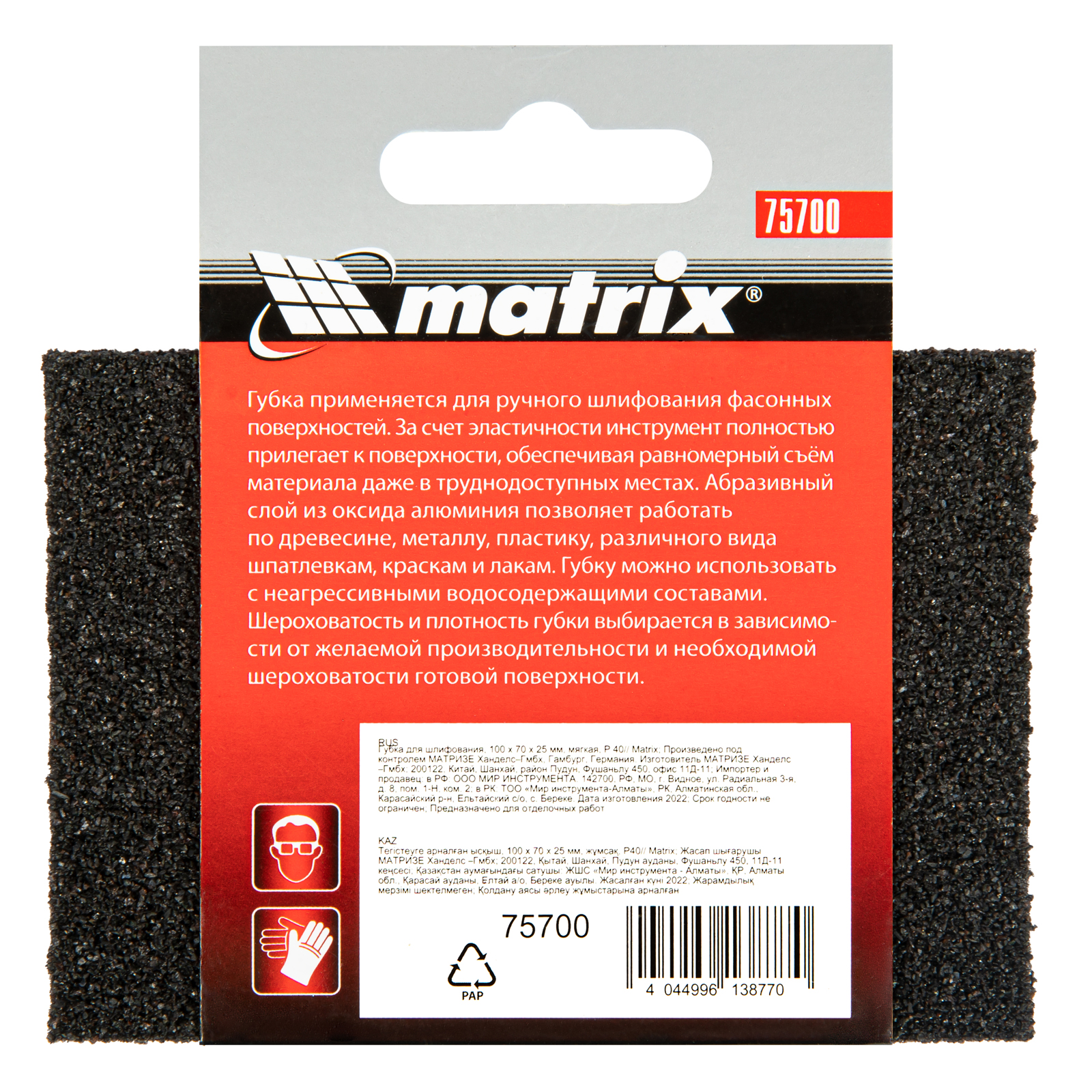 Губка для шлифования, 100 х 70 х 25 мм, мягкая, P 40 Matrix
