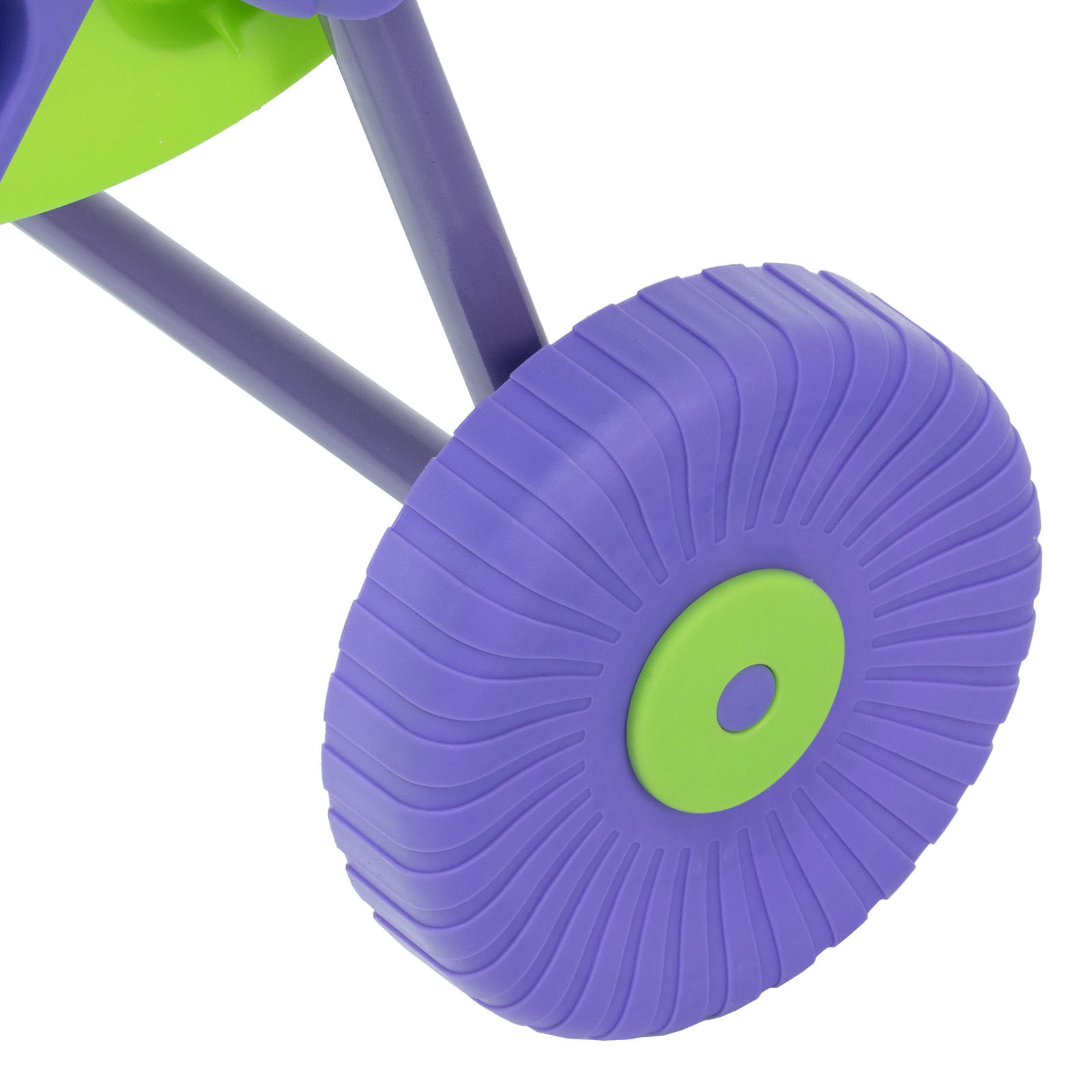 - Удобное хранение и транспортировка — приспособление имеет складную ручку, а крупные колеса упрощают его перемещение по участку.