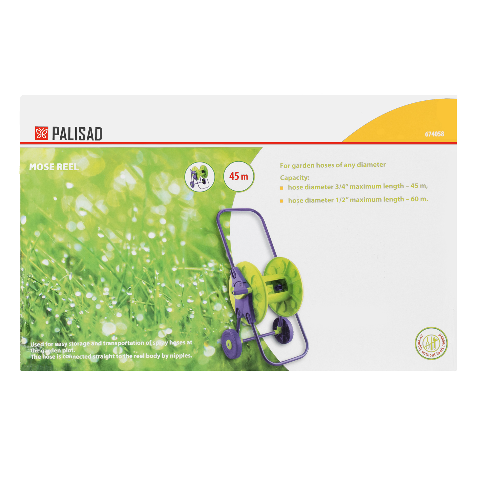 Катушка Palisad на колесах упрощает работу с поливочным шлангом длиной до 45 м. Позволяет регулировать его длину во время работ на участке, а также обеспечивает бережное хранение, предотвращая перекручивание и запутывание. Боковая рукоятка облегчает разматывание и наматывание шланга.