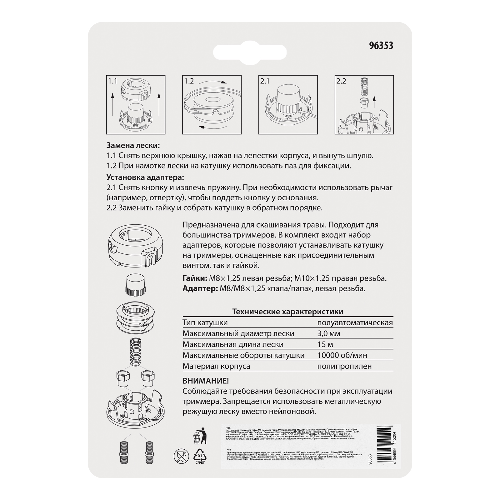 Катушка для триммера Kronwerk 96353 с креплением M8 с шагом 1,25 мм и левой резьбой — сменный элемент для бензиновых и электрических моделей. В качестве режущего элемента используется прочная нейлоновая леска диаметром до 3 мм. Подходящее сечение лески: круг, звезда, треугольник, квадрат, клевер или другое. Катушка поставляется с гайкой M10 с правой резьбой и адаптером M8.