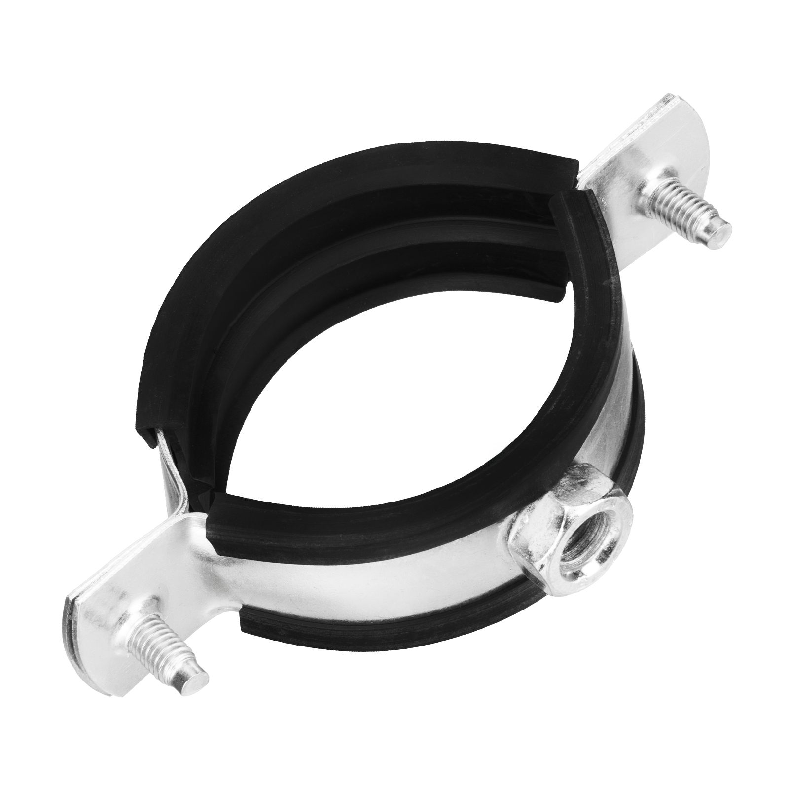 - Хомут для труб состоит из двух частей соединенные винтами, имеет резиновую прокладку для звукоизоляции и виброизоляции трубы, которая изготавливается из прочной резины.