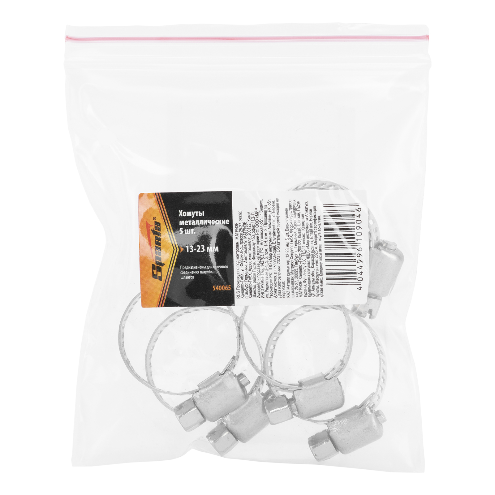 Металлические хомуты Sparta 540065, 5 шт. в упаковке, предназначены для герметизации соединений шлангов и патрубков диаметром 13-23 мм. Используются для строительных и ремонтных работ. Изделия с винтовым креплением устойчивы к давлению и вибрации, подходят для многократного применения.