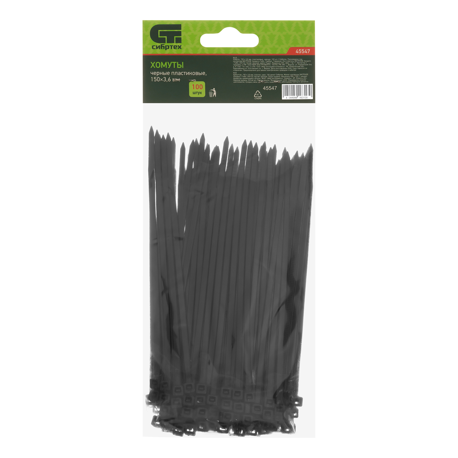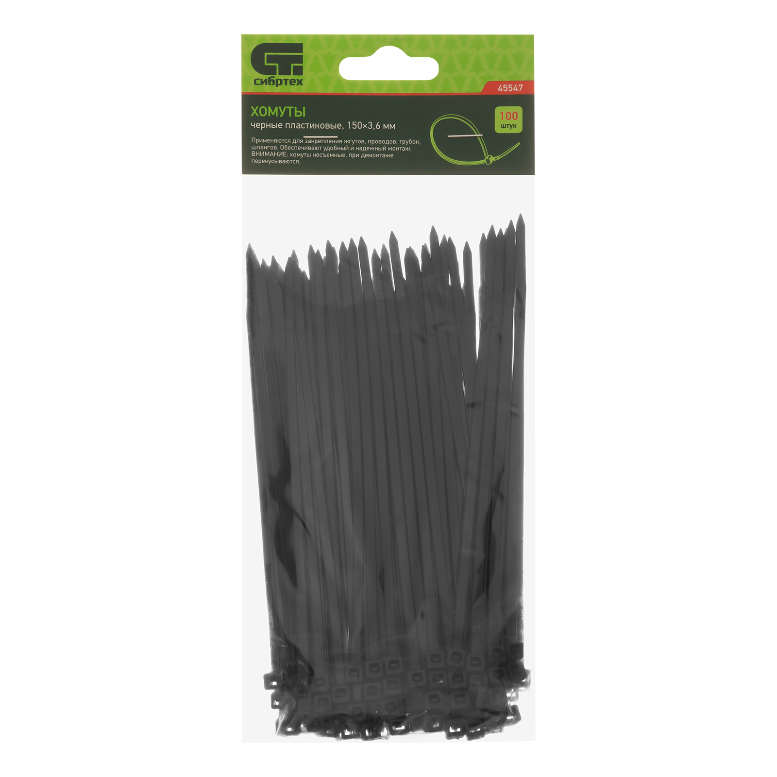 Черные пластиковые хомуты Сибртех 45547, 150 х 3,6 мм, 100 шт. в упаковке, используются для стяжки кабелей, закрепления трубок, шлангов, рекламных конструкций, а также для упаковки различных предметов. Пригодятся во время прокладки электрических и локальных вычислительных сетей, ремонта компьютерной техники, оформлении торговых стендов, комплектовании товара, будут также полезны дома, на даче и в гараже.