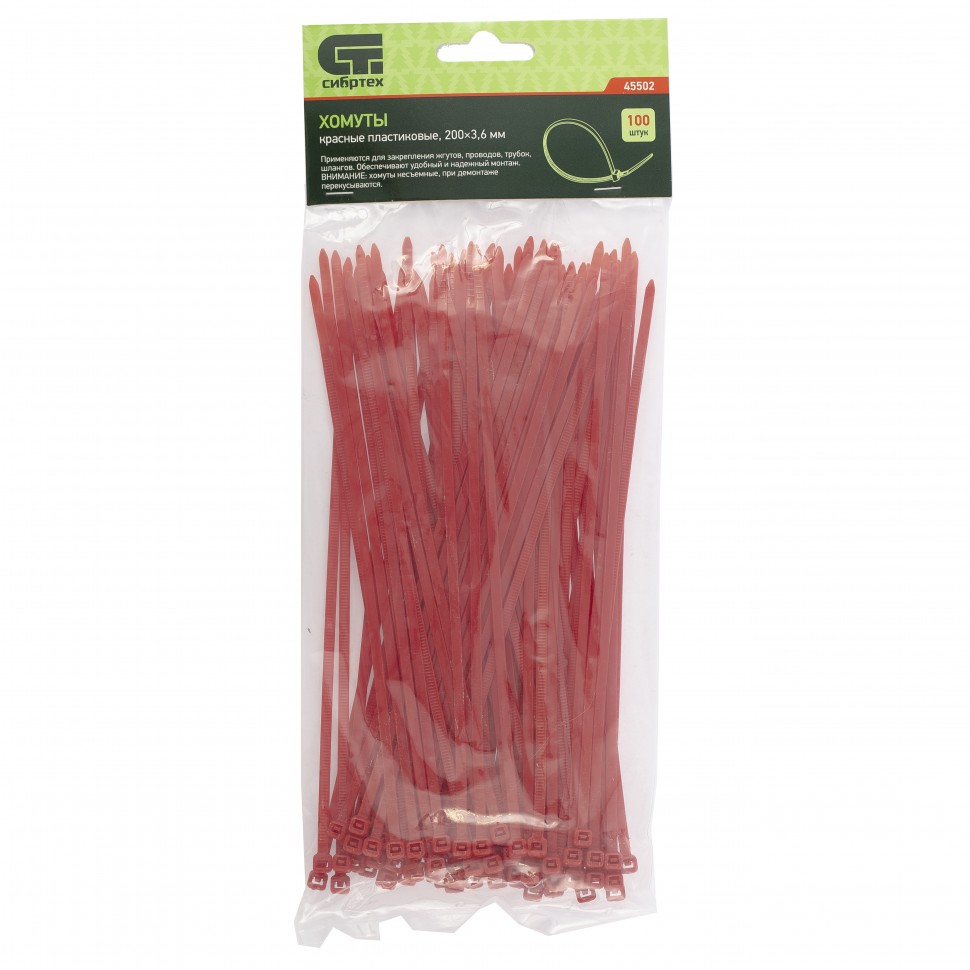 Красные пластиковые хомуты Сибртех 45502, 200 х 3,6 мм, 100 шт. в упаковке, используются для стяжки кабелей, закрепления трубок, шлангов, рекламных конструкций, а также для упаковки различных предметов. Пригодятся во время прокладки электрических и локальных вычислительных сетей, ремонта компьютерной техники, оформлении торговых стендов, комплектовании товара, будут также полезны дома, на даче и в гараже.