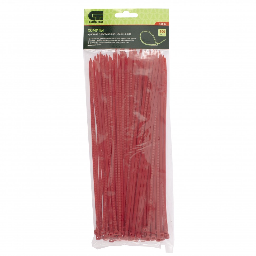 Красные пластиковые хомуты Сибртех 45503, 250 х 3,6 мм, 100 шт. в упаковке, используются для стяжки кабелей, закрепления трубок, шлангов, рекламных конструкций, а также для упаковки различных предметов. Пригодятся во время прокладки электрических и локальных вычислительных сетей, ремонта компьютерной техники, оформлении торговых стендов, комплектовании товара, будут также полезны дома, на даче и в гараже.