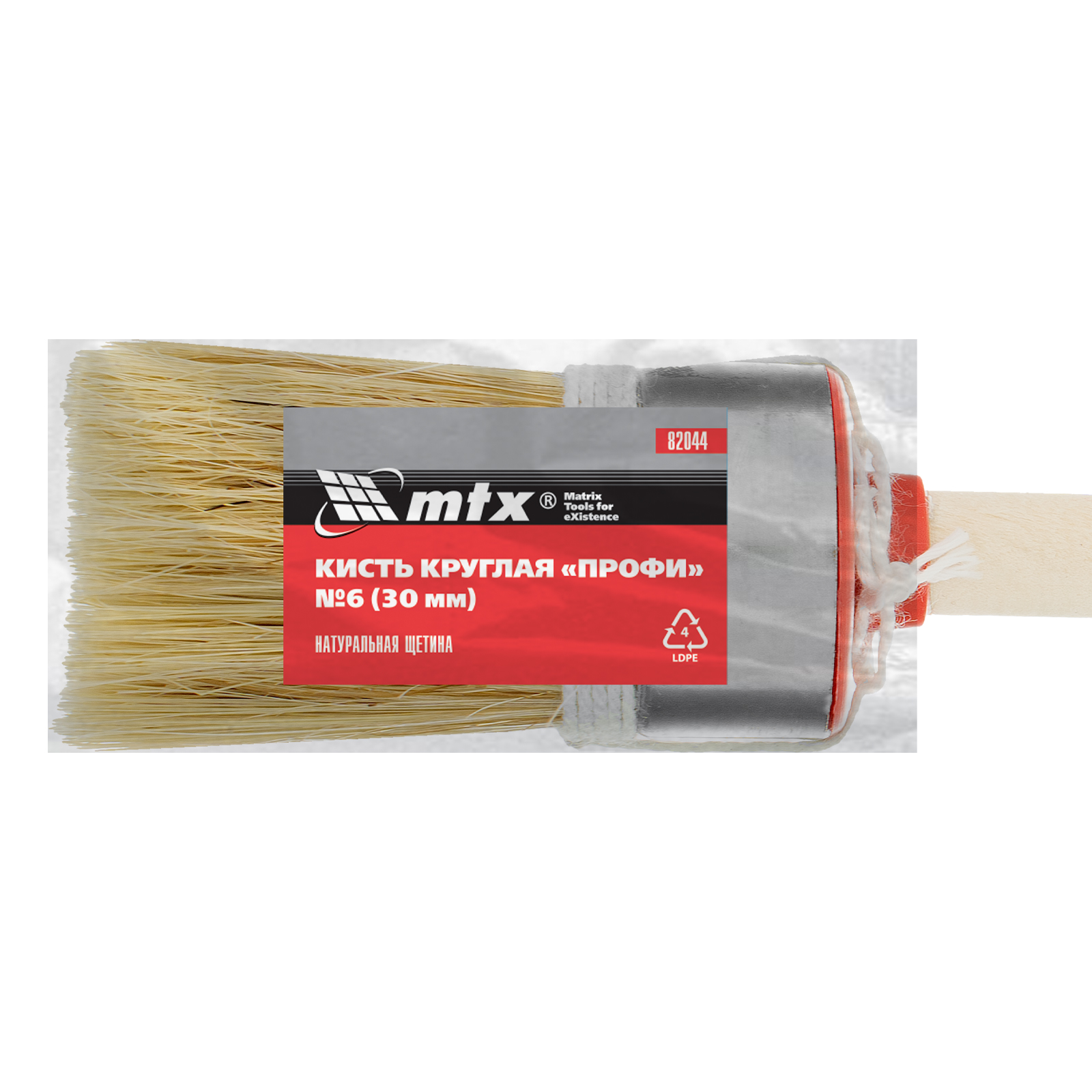 Круглая кисть MTX Профи №6 82044 диаметром 30 мм, с натуральной щетиной и деревянной ручкой, используется при проведении профессиональных малярных работ. Рабочая часть из натуральной свиной щетины с небольшим добавлением искусственной устойчива к агрессивным масляным краскам и ЛКМ на основе растворителей. Круглая кисть оптимально подходит для окрашивания узких и труднодоступных участков.