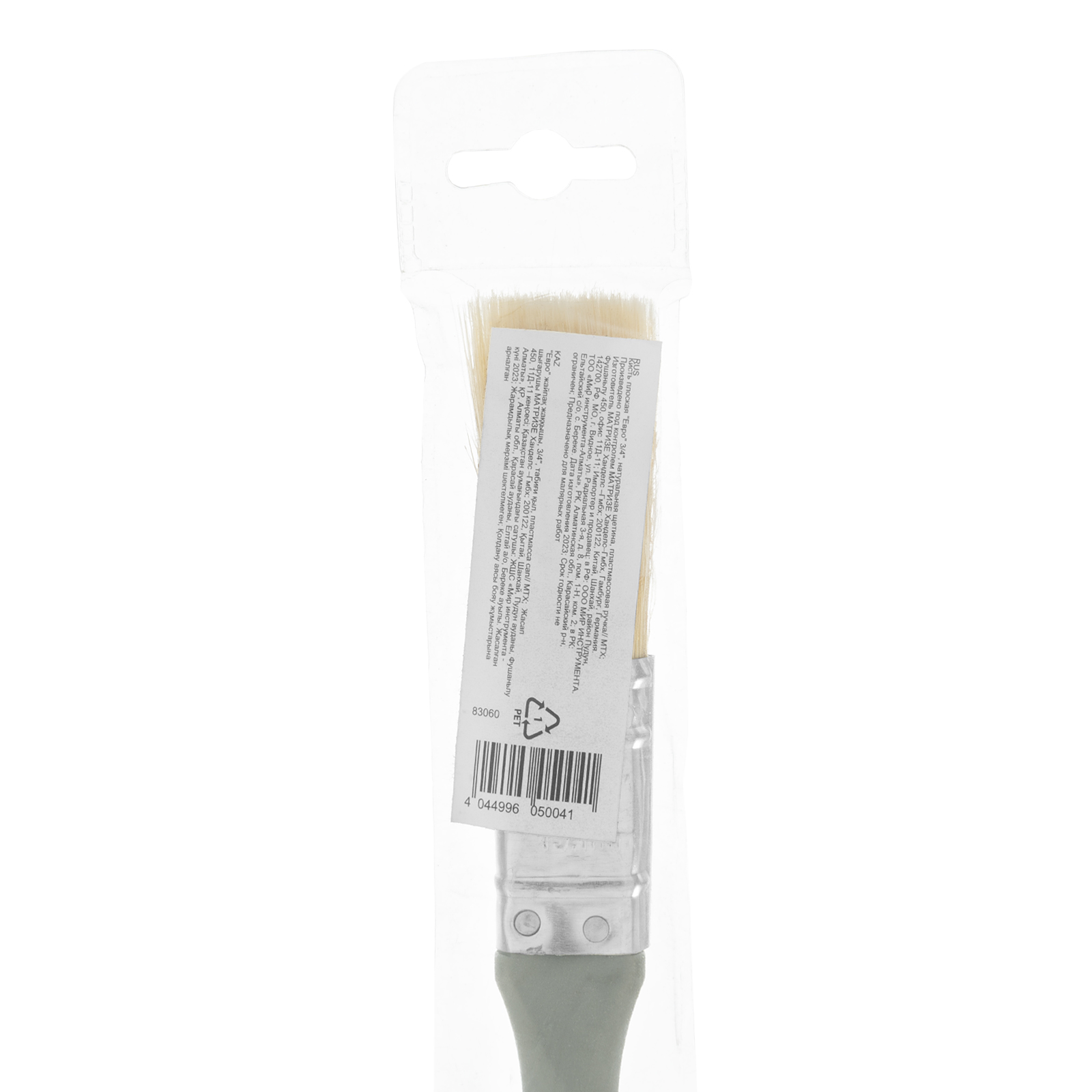 Плоская кисть MTX «Евро» 83060 шириной 3/4 дюйма, с натуральной щетиной и пластмассовой ручкой, используется для профессионального окрашивания поверхностей. Рекомендуется для нанесения агрессивных ЛКМ с содержанием растворителей.