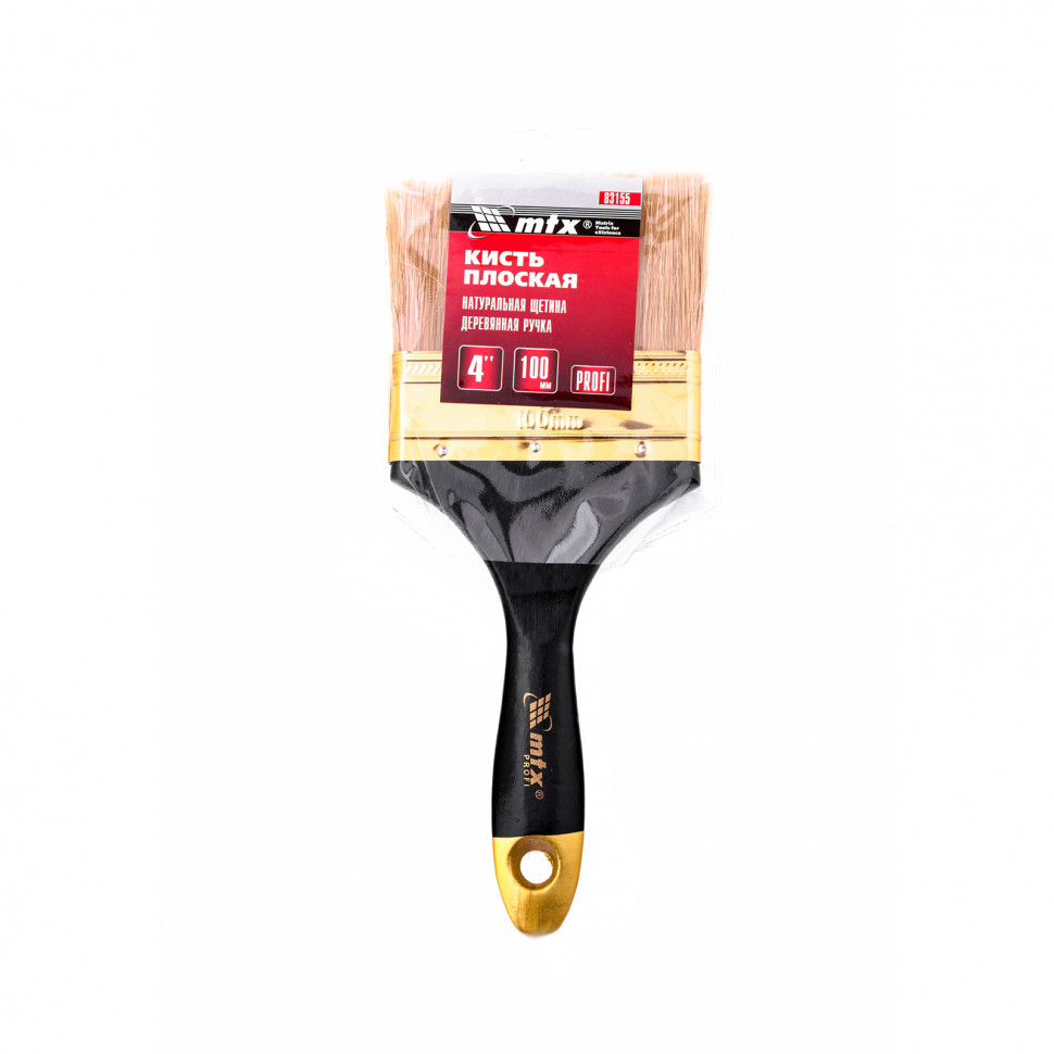 Плоская кисть «Профи» MTX 83155 шириной 4 дюйма, с натуральной щетиной и деревянной ручкой, рассчитана на профессиональное выполнение малярных работ. Натуральная щетина с увеличенной плотностью набивки подходит для нанесения различных типов ЛКМ, в том числе содержащих растворители.