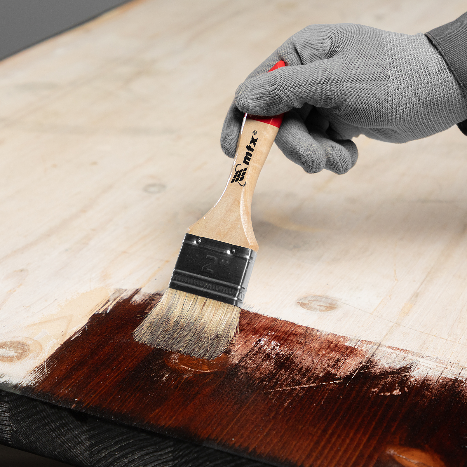 Плоская кисть MTX «Стандарт» 82530 шириной 2 дюйма (50 мм), с натуральной щетиной и деревянной ручкой, — инструмент для проведения бытовых малярных работ. Натуральная светлая щетина обладает высокой износоустойчивостью и подходит для нанесения красок на основе растворителей. За счет ширины 50 мм кисть подходит для окрашивания узких поверхностей, например, рам.