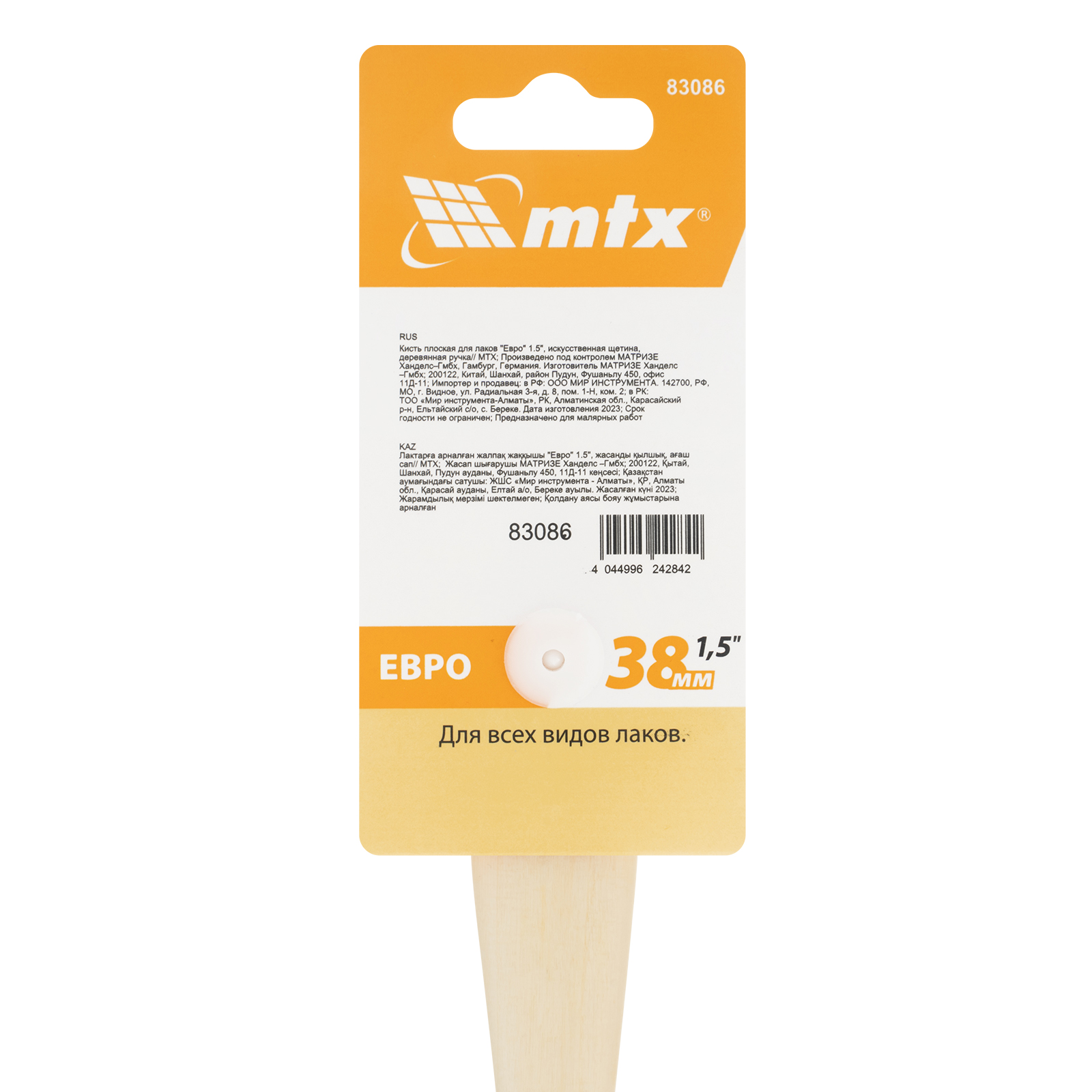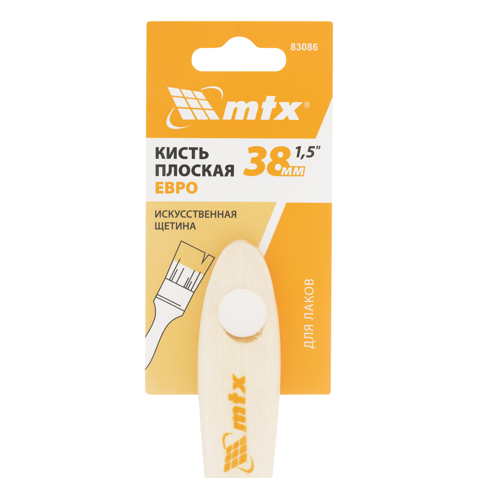 Кисть плоская MTX «Евро» 83086 шириной 1,5", с искусственной щетиной и деревянной ручкой, пригодится при проведении малярных работ. Предназначена для работы с любыми типами лаков. Мягкая и упругая щетина оптимальна для нанесения покрытий на гладкие и слегка шероховатые поверхности.
